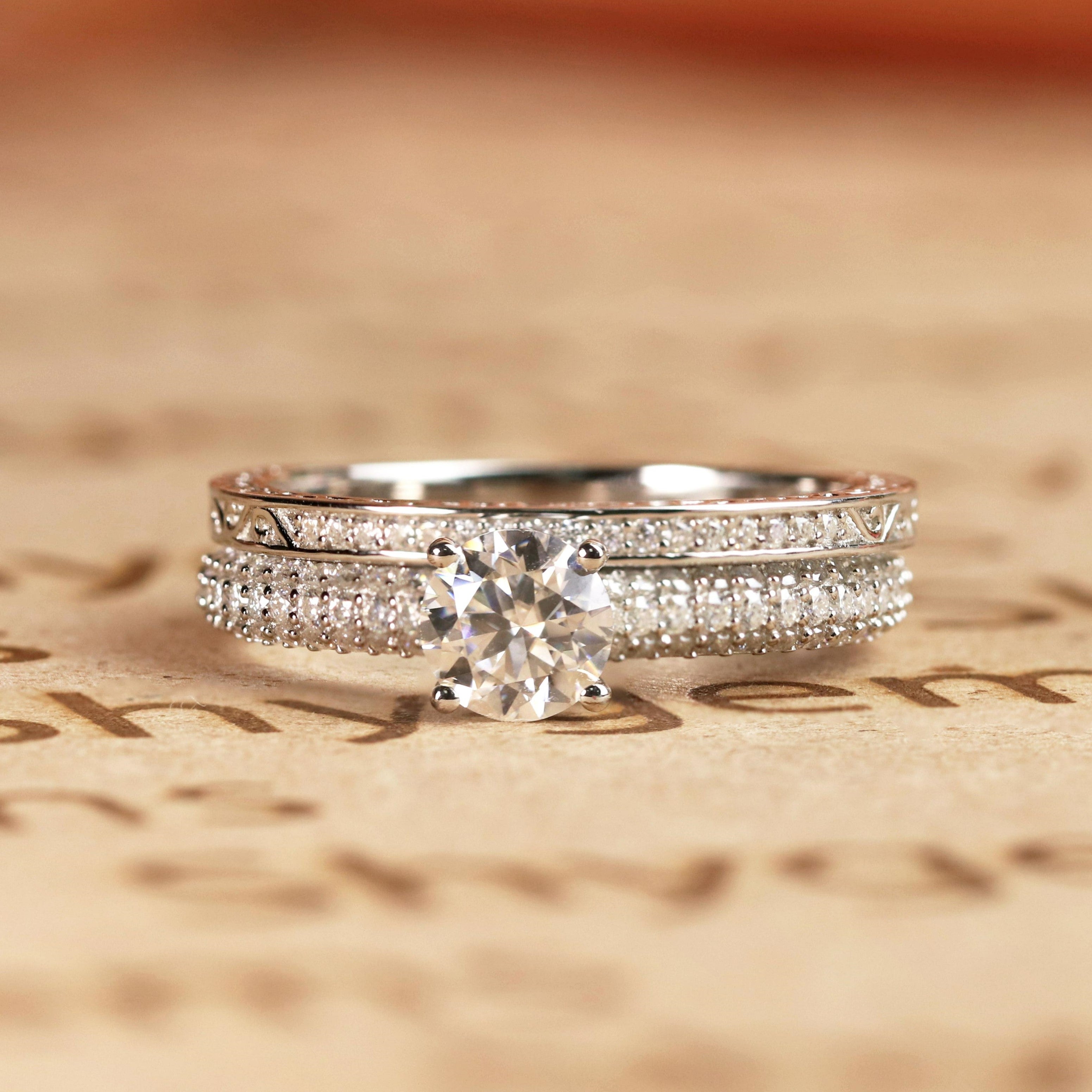 Express your deepest love and commitment with our exclusive 1.5 Carat Round Cut Real Moissanite Wedding Set in 18k White Gold Over Silver. This Cluster Bridal set features a 1 carat Moissanite center stone, and 0.5 carat moissanite side stones, for a total 1.5 carat. The cluster and two row design engagement ring is made with natural and real moissanite, high quality zirconium, and real 18k gold plating over silver. To accompany your vows, a matching classic wedding band completes this beautiful look. This piece of jewelry is handmade, sporting quality craftsmanship that will last for years to come. As always, the order comes with 30 days full refund policy. The beautiful moissanite ring also comes in a very beautiful jewelry ring pouch.