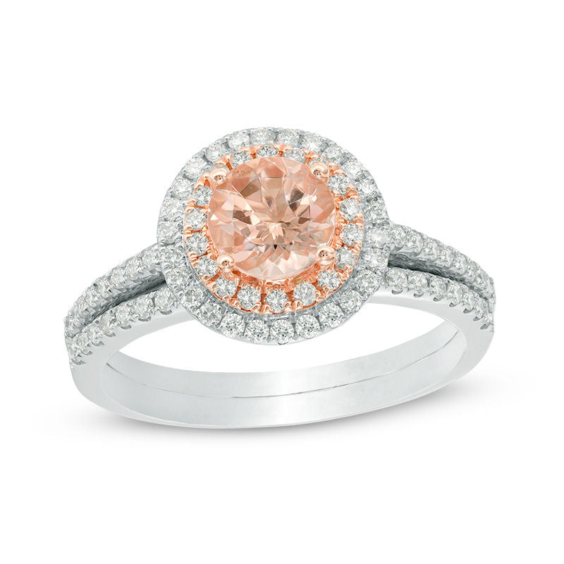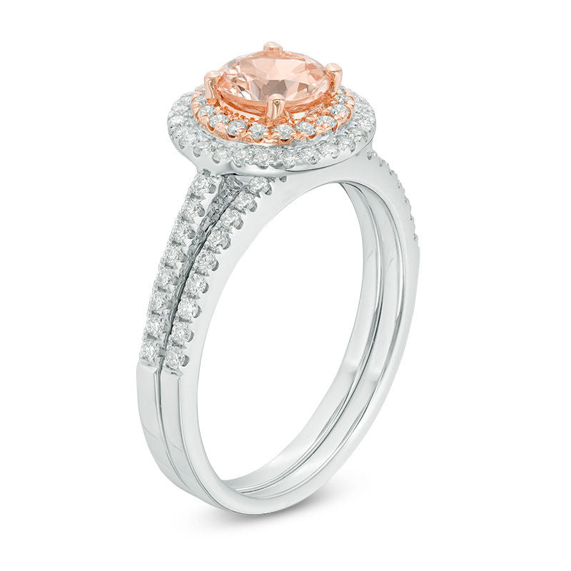 2 carat round cut morganite and moissanite two tone double halo wedding set on 18k rose gold over silver. Handmade and customized to your requirement, the beautiful engagement ring celebrates true love at very affordable price. The beautiful and classic morganite engagement ring for women is sure to please her at very first sight. The bridal wedding ring is crafted in 18k Gold over Silver and made with real and high quality Moissanites that can be a perfect alternative to diamond rings as moissanites have almost the same durability and quality as with diamonds that will last for a lifetime.