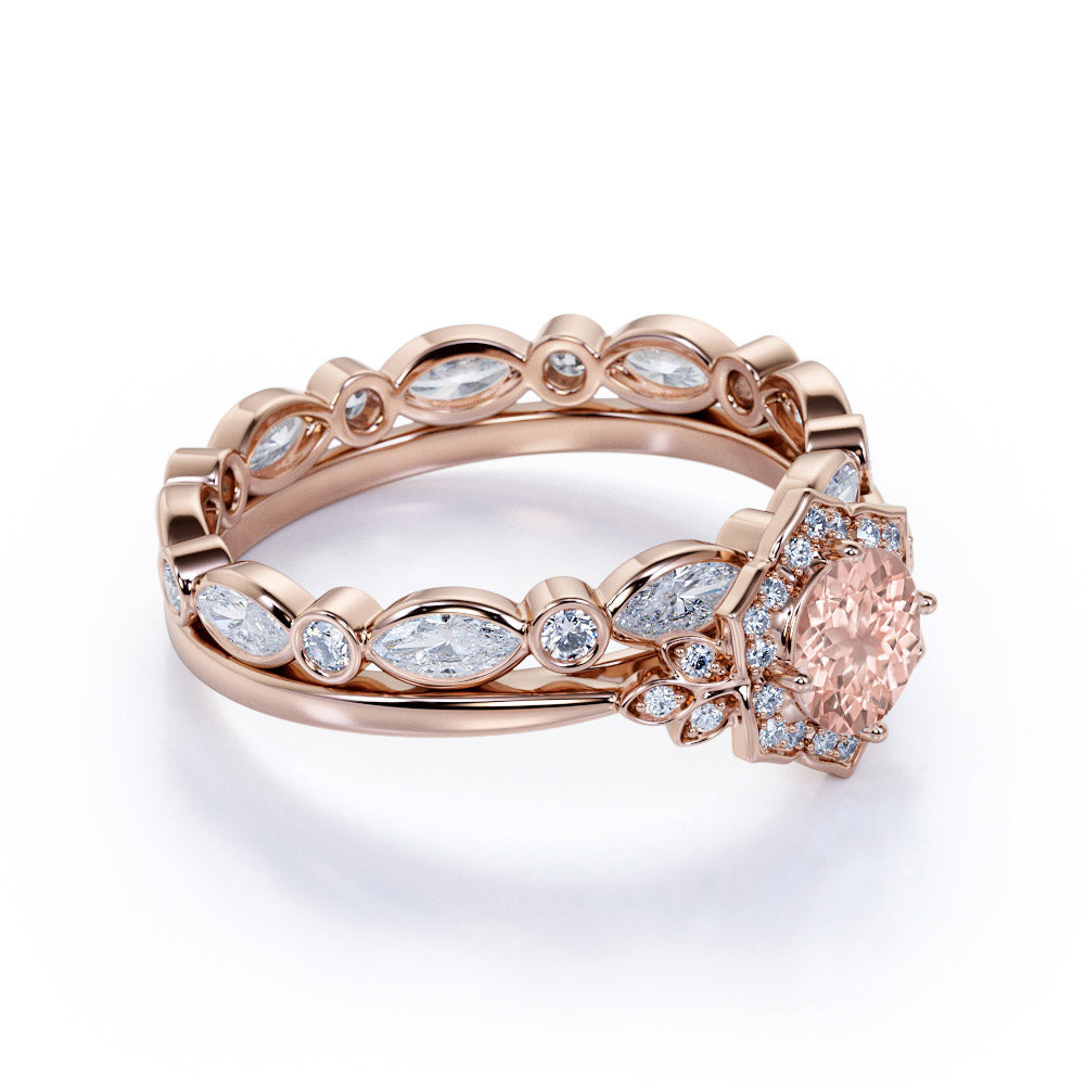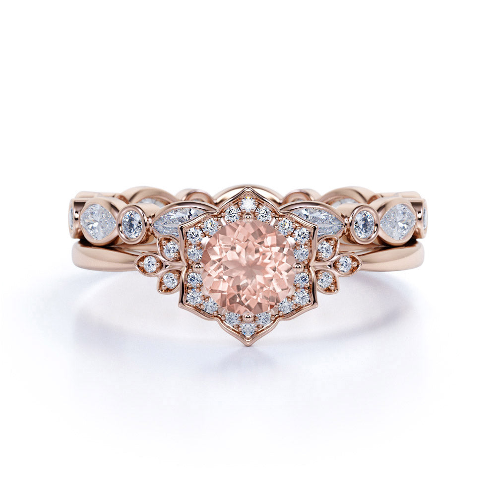 1.75 Carat Round Cut Morganite Bridal Set - Wedding Set - Bridal Trio Set - Antique Ring - Art Deco Ring - 18k Rose Gold Over Silver