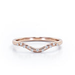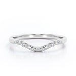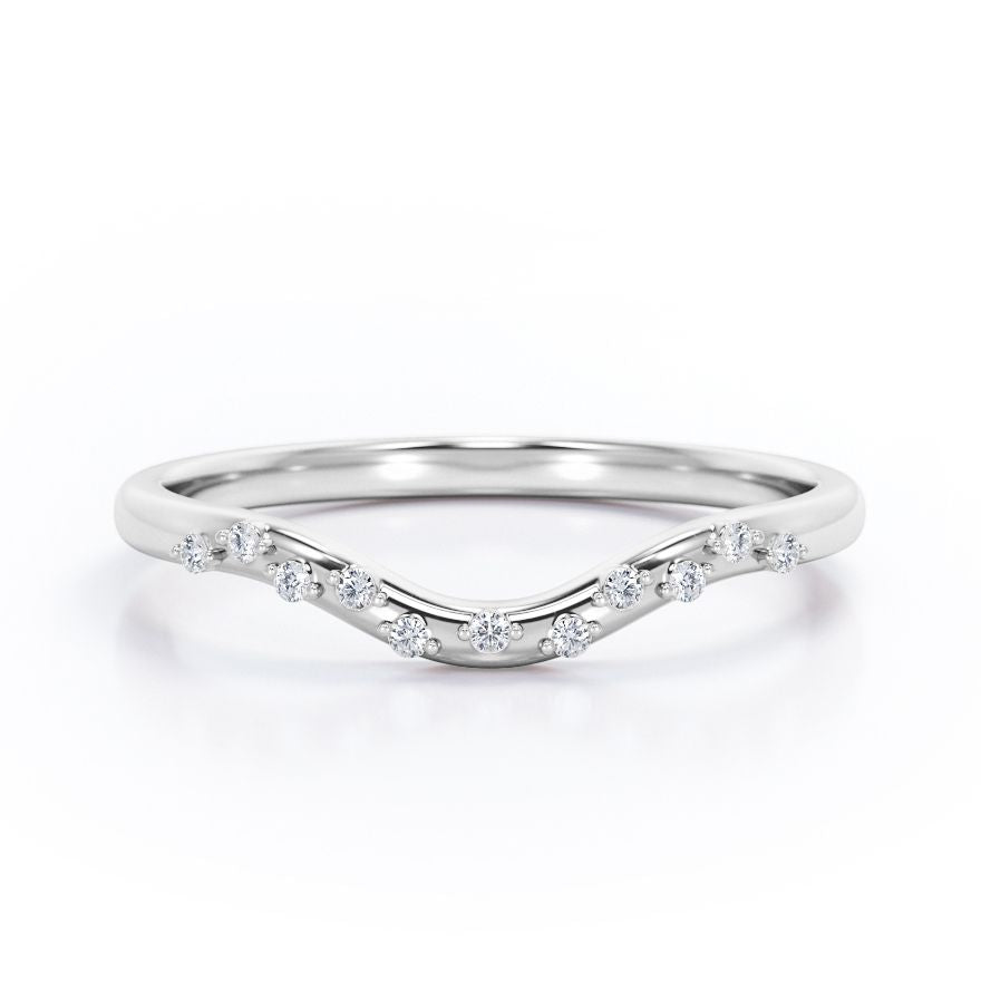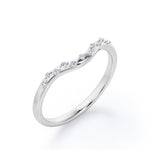 Be highly stylish with this 2-Prong Flush 0.10 TCW Curved Wedding Band. Handcrafted with care into a wonderful round cut by our lapidary expertise, this flawless Moissanite band features total 0.10 carat Moissanite. Distinct and unusual, this Moissanite wedding band is ideal for those who wish to express their charisma and uniqueness. with its dazzling beauty, this Moissanite band will bring joy and good energy to its wearer. Beautiful and affordable, this affordable Moissanite wedding band is a great choice for any woman's jewelry collection. If you are looking for a Moissanite ring for any special event, such as a birthday, an engagement, or a marriage proposal, this inexpensive Moissanite wedding band a great choice. Additionally, this Moissanite wedding band can be customized, so customers can choose one of metal colors between white gold, rose gold, yellow gold or black gold. Your love story will be complete with this Moissanite wedding ring band.