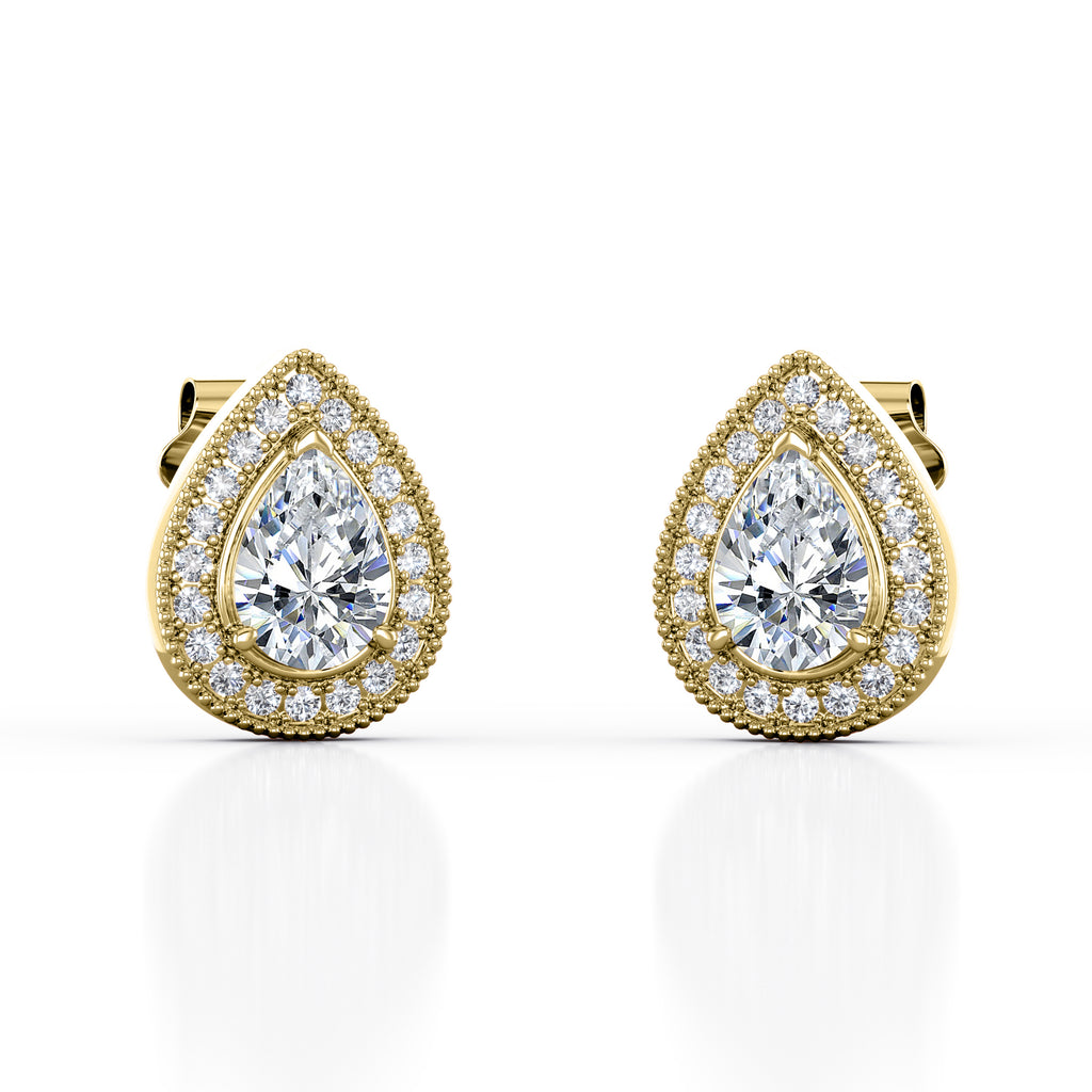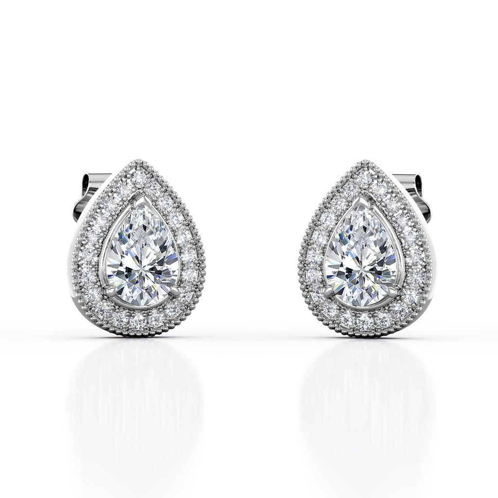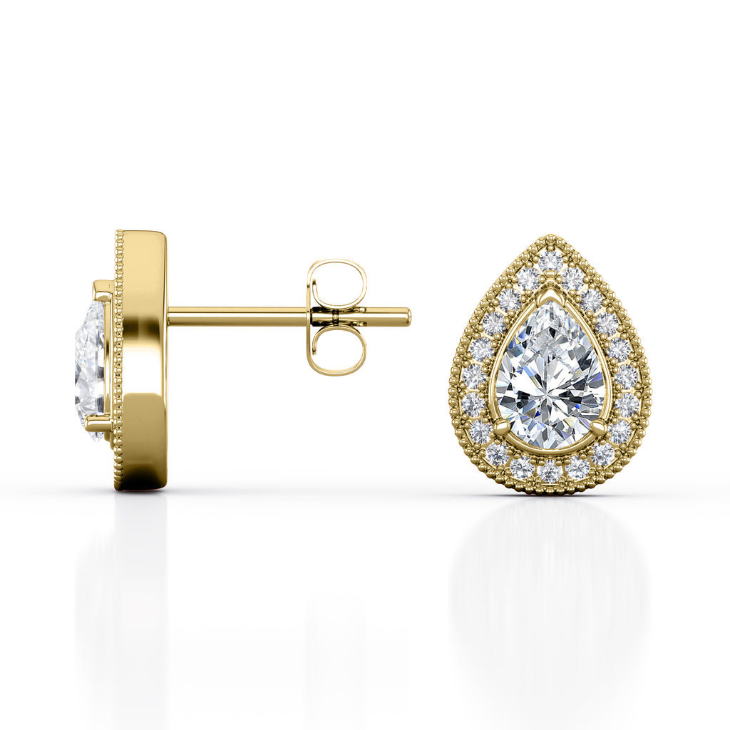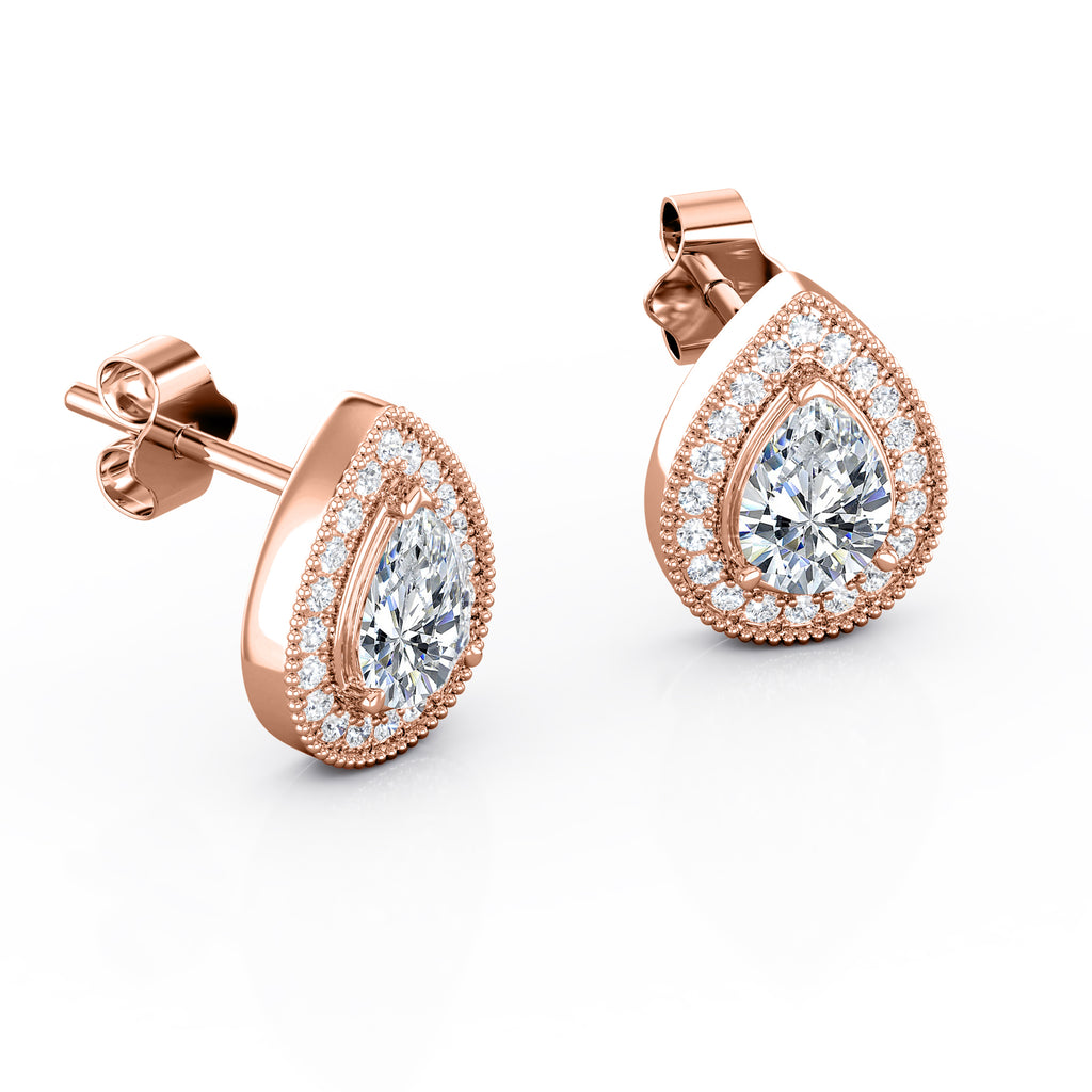 3 Prong Art Deco 1.10 Carat Pear Cut Certified Moissanite and Diamond Scallop Pave Stud Earrings in Rose Gold