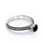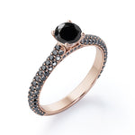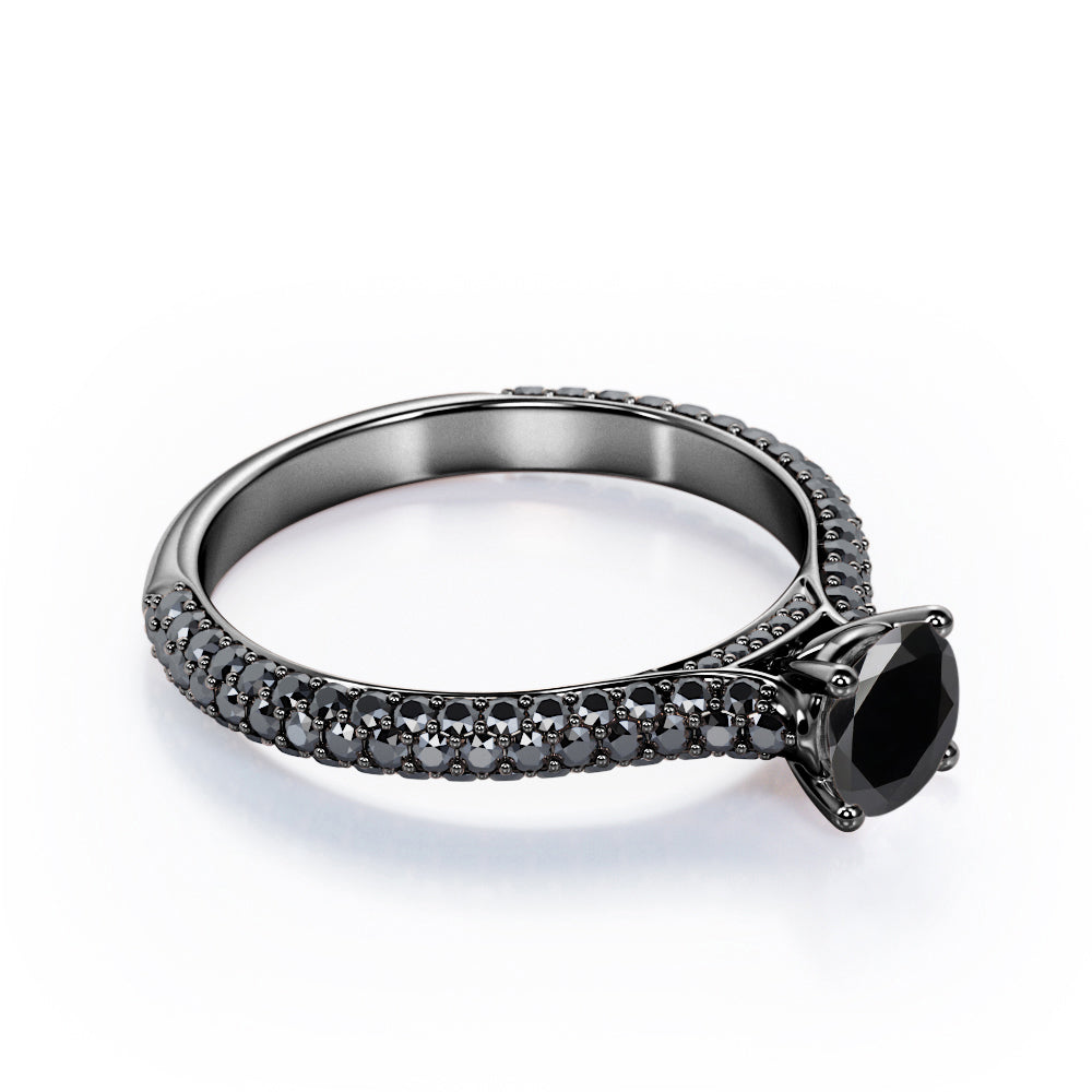 Create a magical moment with this 3-Row Micro Pave - 1.35 TCW Round Shaped Lab Created Black Diamond - Cathedral Engagement Ring in White Gold. Professionally handcrafted into a fine round cut by our skilled jewelers, this astonishing black diamond engagement ring is composed of total 1.35 carat lab created black diamond on solid white gold. Distinctive and extraordinary, this black diamond gemstone ring is well-suited for those who are not quite into normal lifestyle. With its charming color, this black diamond jewelry will enhance happiness and attract positive vibes. This black diamond jewelry is beautiful and accessible since it is available at a reasonable price. If you are in search of an incredibly romantic gift for your significant other, our black diamond gemstone ring can be a good choice for any special occasion, i.e. a birthday ring, an engagement or marriage proposal ring, a Valentines' day ring, etc. Also, this black diamond stone ring can be customized to your own choice of metal colors: white gold, rose gold, yellow gold or black gold in 10k and 14k gold metal options. Let’s impress her with this black diamond ring and, surely, she will not regret it.