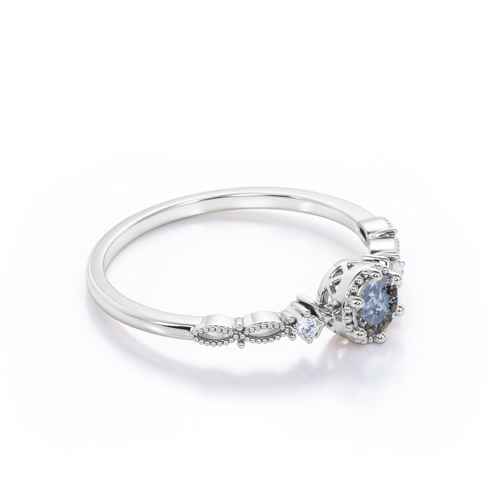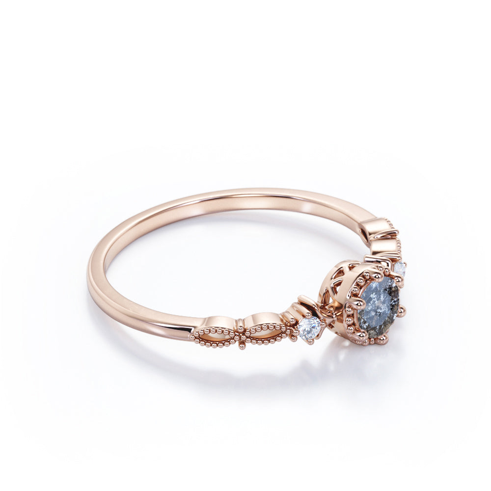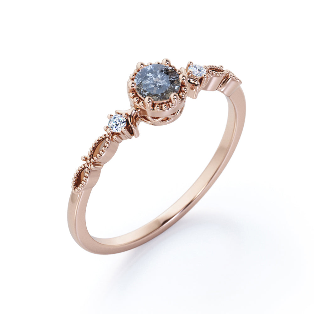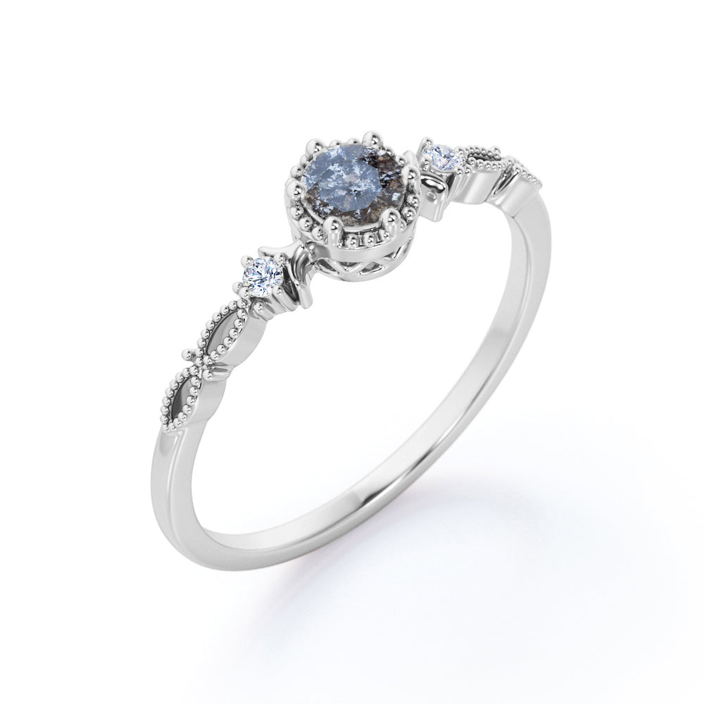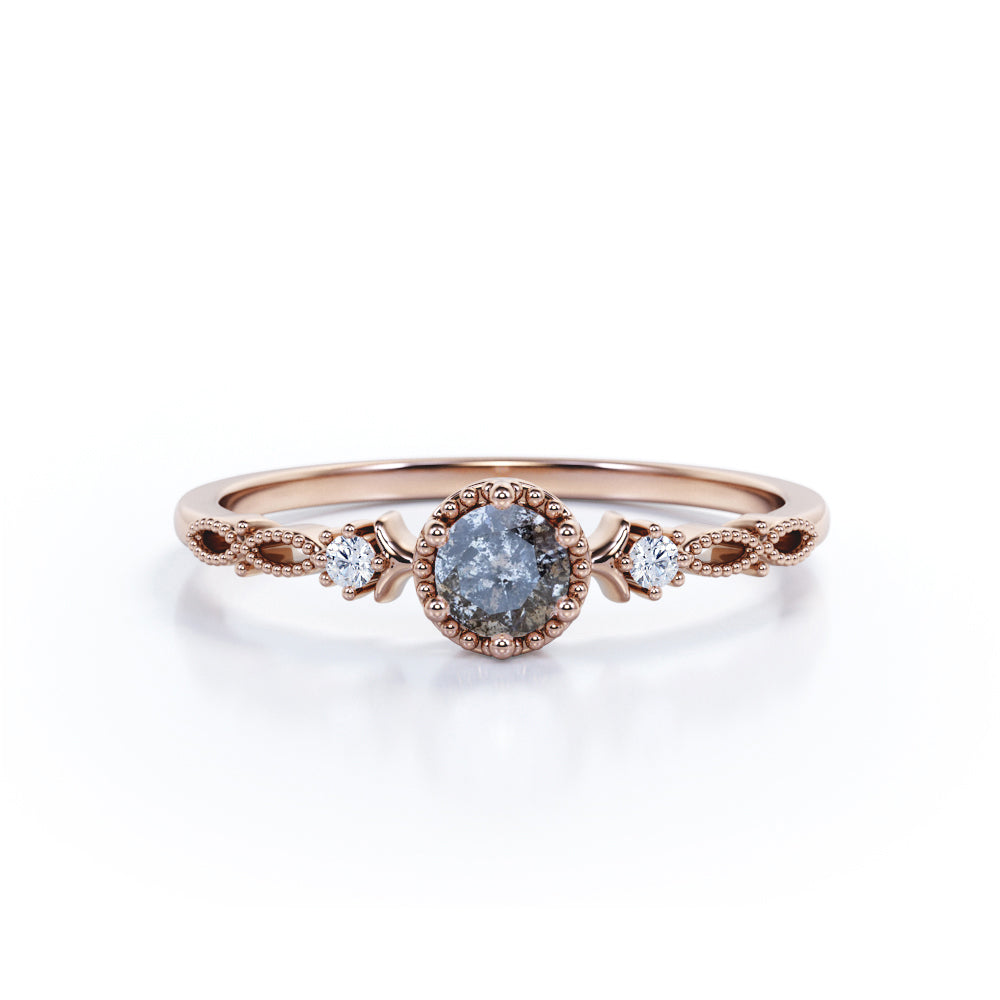 IMPORTANT NOTE: Since each Salt and Pepper Diamonds is one of a kind, the actual color of it may vary from the one that is pictured above. Thanks to its enchanting black and white inclusions, this 3 Stone Bezel Set 0.60 Carat Round Cut Galaxy Black Grey Salt and Pepper Diamond Milgrain Engagement Ring will be as unique as its wearer. This trilogy ring features .50 carat round cut natural Salt and Pepper Diamond and .10 carat real side Diamond for gold ring and Moissanite for silver ring. This classic engagement ring can be customized to either 10k, 14K and Gold over Silver and either Black Gold, Rose Gold, White Gold or Yellow Gold. Also, as your satisfaction is our most priority, we will do our best to have your handmade jewelry be carefully and beautifully crafted by our expert jewelers. The order also comes with a 30-day full refund policy. This ring will be a perfect gift for any occasions: birthday, anniversary, proposal, Valentine's day, Christmas, and any other special events. This ring is very exclusive due to the unique inclusions of Salt and Pepper Diamond that appears black and white. Ornament and distinguish your love story with the neat distribution of black and white inclusions of Salt and Pepper Diamond. It provides an ideal way to stand out from crowd with a gorgeous and distinctive ring. This antique ring is available at a very affordable price yet it offers a very expensive and gorgeous look on your finger. Create a fascinating look on your finger with this Salt and Pepper Diamond ring for women which is available in both solid gold and sterling silver. Impress your special someone with this beautiful and affordable ring. Its inclusions reminds us that beauty doesn't always lie in perfection. It is the perfect match for those who are looking for a remarkable gemstone rings as Salt and Pepper embodies their own unique combination of color and uplifting meaning.