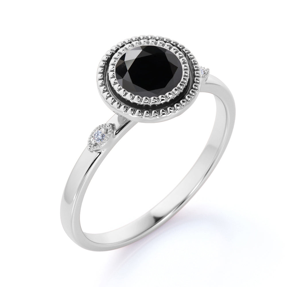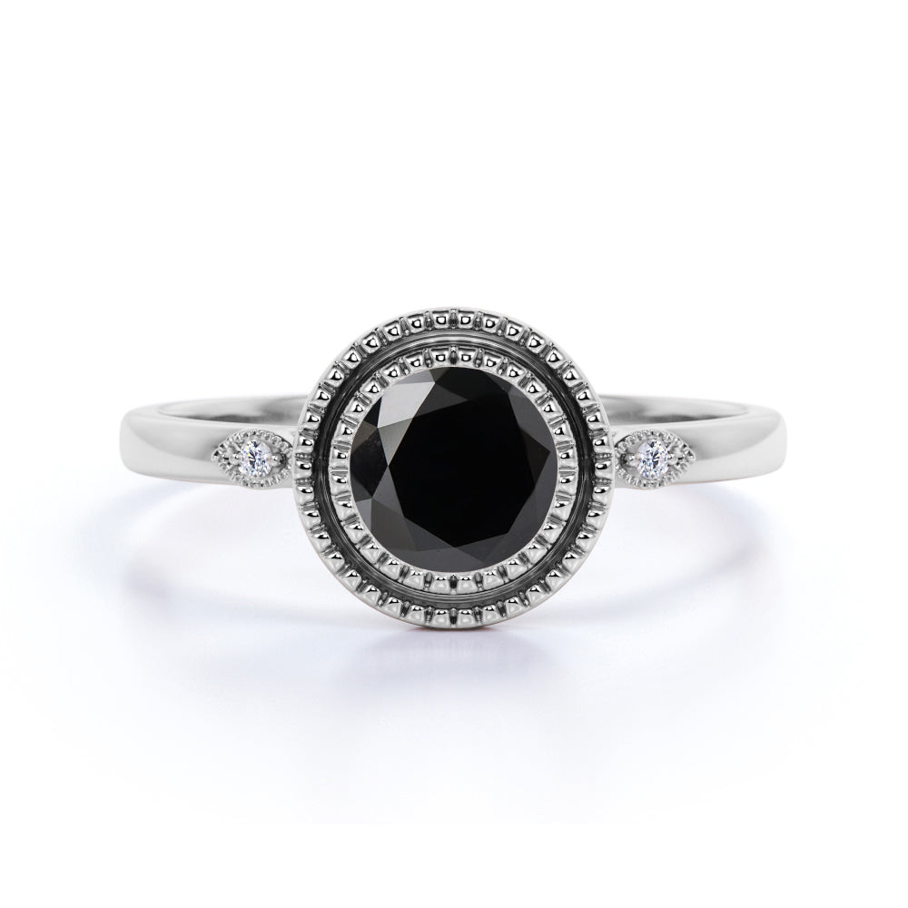 All of our rings are genuine, real and authentic. Perfect for valentine, mother's day, anniversary gift and at a very reasonable prices. This black diamond ring is also considered the new vintage art deco engagement ring, because of its art deco style that is unique and one of a kind ring design. This black diamond ring features an approximately 1.50 carat round cut lab created black diamond, surrounded by .10 carat authentic side diamonds, for a total weight of 1.60 carats.