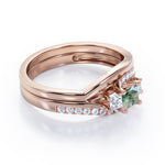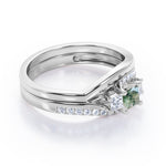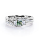 A 3 Stone Shared Prong - 1 TCW Princess Cut Diamond - Pave Curved Shank Wedding Set - Rose Gold contains a bypass engagement ring with wedding band. The promise ring features trio stones of princess Green Moss Agate and Moissanite; a 0.5 carat Green Moss Agate is set between the small square Moissanite. The shank are wrapping around the center and it is adorned by paved round Moissanite by half of the band, adding more sparkle to the ring. Comes with the promise ring is a curved wedding band. It is plain and classy, suitable for every who loved minimal style ring and it can be matched with any other fine jewelry. Both rings can be made in 18k gold over silver, 10k gold and 14k gold with the color of white gold, rose gold, yellow gold and black gold.