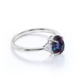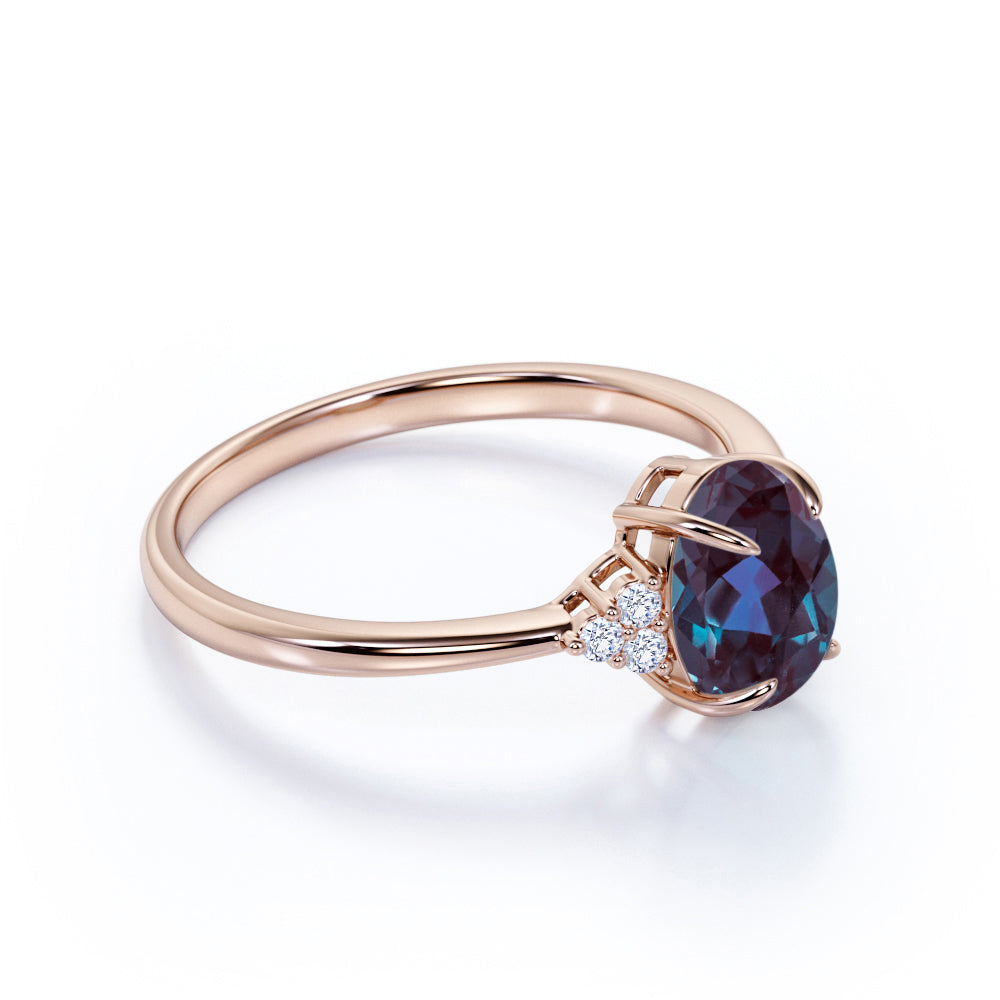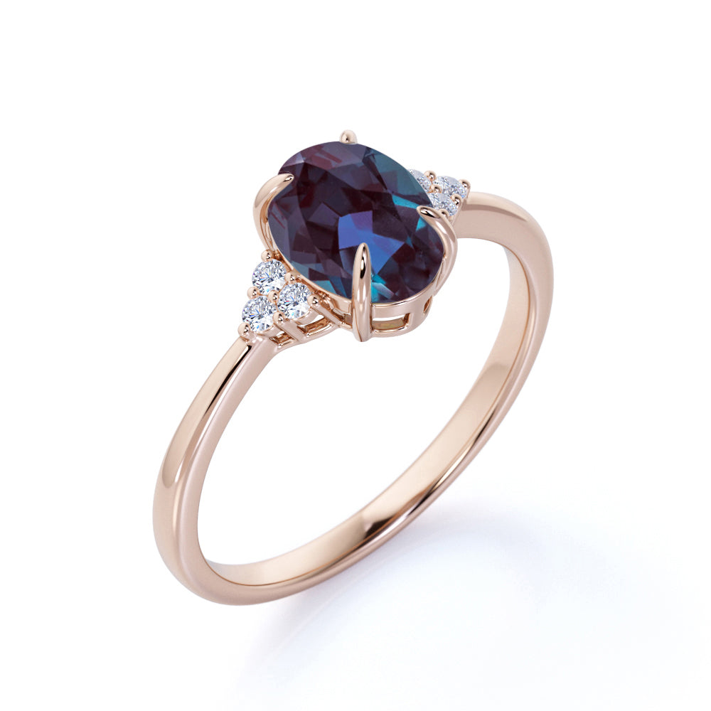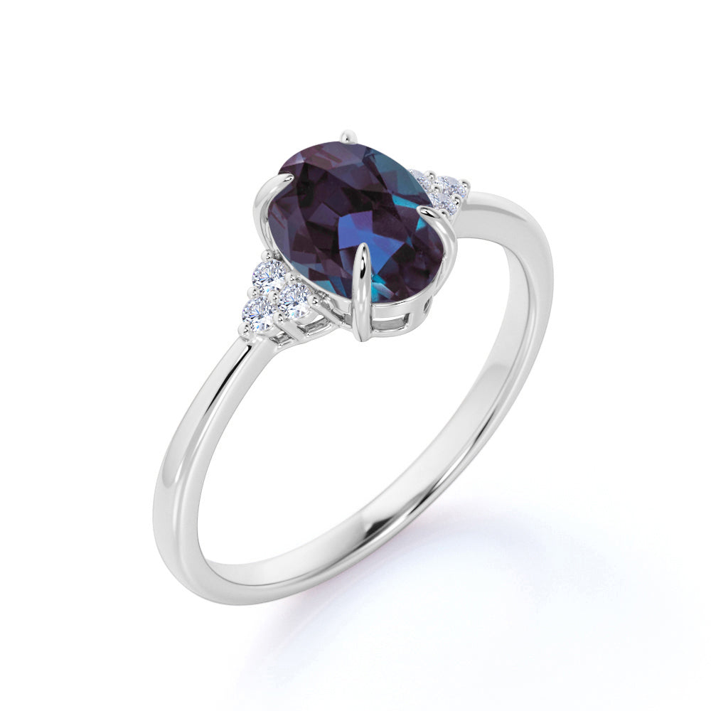 Be on cloud nine with this 4 Claws Prong Basket 1.15 Carat Oval Cut Simulated Alexandrite and Diamond 7 Stone Engagement Ring. This minimalist ring features 1 carat oval cut lab grown Alexandrite and .15 carat real genuine side diamond for gold ring and moissanite for silver ring. This simple engagement ring can be customized to either 10k, 14K and Gold over Silver and either Black Gold, Rose Gold, White Gold or Yellow Gold. Also, as your satisfaction is our most priority, we will do our best to have your handmade jewelry be carefully and beautifully crafted by our expert jewelers. The order also comes with a 30-day full refund policy. Enrich your charm and charisma with this vintage mystic lab grown Alexandrite ring for women that is excellent for everyday wear. Being one of the rarest gemstones in the world, this ring will create a charming and fascinating look on your fingers. This fascinating ring is a perfect match for those who are looking for symbol of luck, hope and good fortune. Ornament your love story with this stunning color changing lab made Alexandrite ring inviting more happiness and joy into your marriage life. This stunning color-change lab created Alexandrite ring will absolutely complement any style of its wearer. Embellish your love story with this beautiful man made Alexandrite ring and make it even more memorable. This ring will surely complement every style of its wearer. This ring is available at a very affordable price yet it offers a very expensive and gorgeous look on your finger. Those who has a penchant for vintage and flawless ring would completely fall in love with this affordable synthetic Alexandrite ring. Handcrafted with love, this antique man made Alexandrite ring will complement any style and enhance the charm of its wearer.