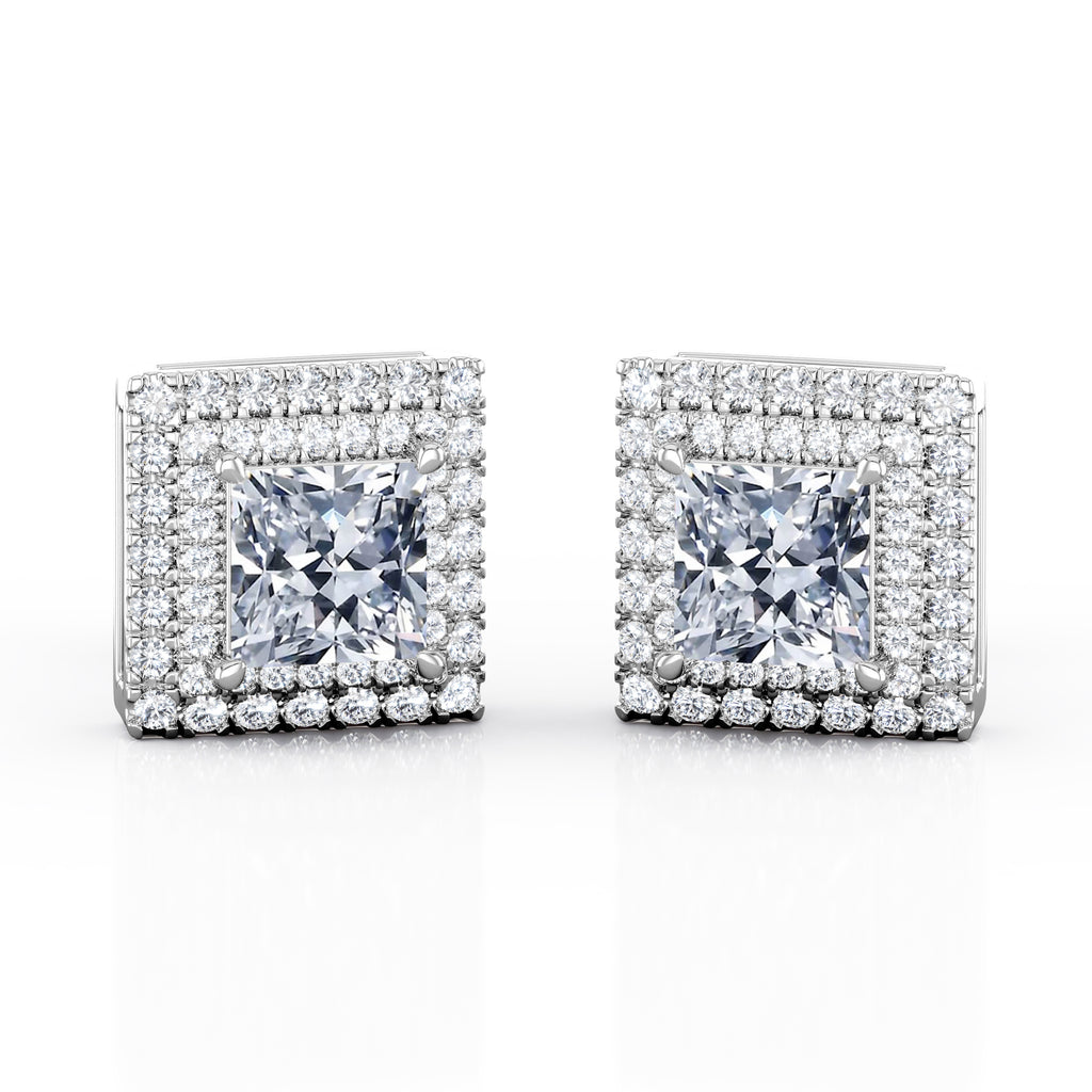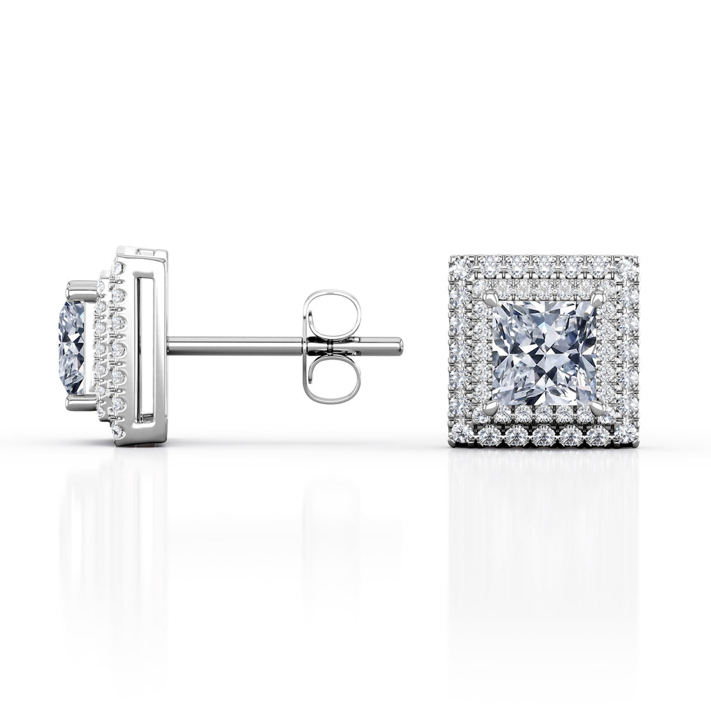 4 Prong Setting 1.20 Carat Princess Cut Certified Moissanite and Diamond Double Halo Encrusted Stud Earrings in White Gold