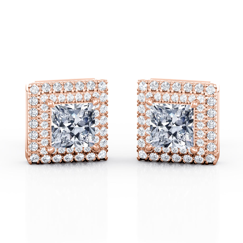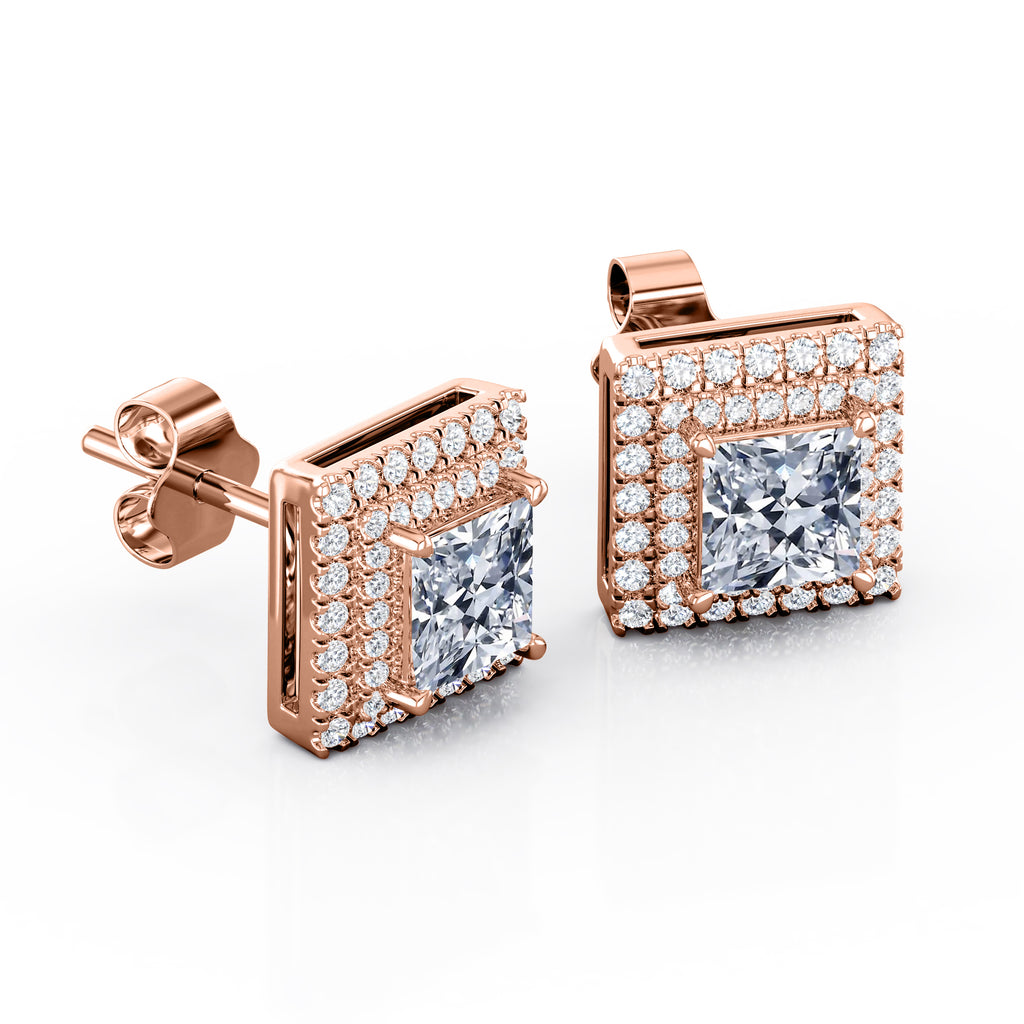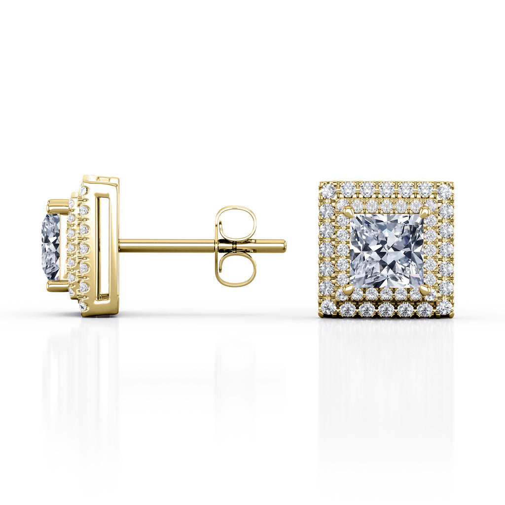 This 4 Prong Setting 1.20 Carat Princess Cut Certified Moissanite and Diamond Double Halo Encrusted Stud Earrings in White Gold will always fit any looks whether it is for yourself or for your special someone. This designer ear studs display an approximate .50 carat princess cut certified moissanite on each side, surrounded by .20 carat side diamond, for a total 1.20 carat. A certificate of authenticity will be provided with every orders. Our moissanites are D (colorless) in color and VVS1 in clarity. This pair of earrings can be customized to either Rose Gold, White Gold, Yellow Gold or Black Gold. Also, it can be made with 18k Gold over Silver, 10k Gold, 14k Gold or 18k Gold. All our jewelry are precisely handmade to order by our experienced jeweler. Made with love, deliver to you with care. All order comes with satisfaction guarantee policy. If your are not satisfied with your purchase, you can request a refund within 30 days upon receipt of the item without question asked. Build your own special earrings and show your love for someone. With its brilliance, it always shine and sparkle on her ears. Perfect for everyday wear, it's comfortable to wear and matches any outfit. It is one of the sublime gifts for any events such as Anniversaries, Birthday, Mother's Day, Valentine's, Graduation, Christmas, etc. Completely handcrafted, it shows the best radiance and dazzle. This pair of earrings will surely take her breath away with its dazzling sparkle. Customized, Personalized, The sublime gift for your loved one.