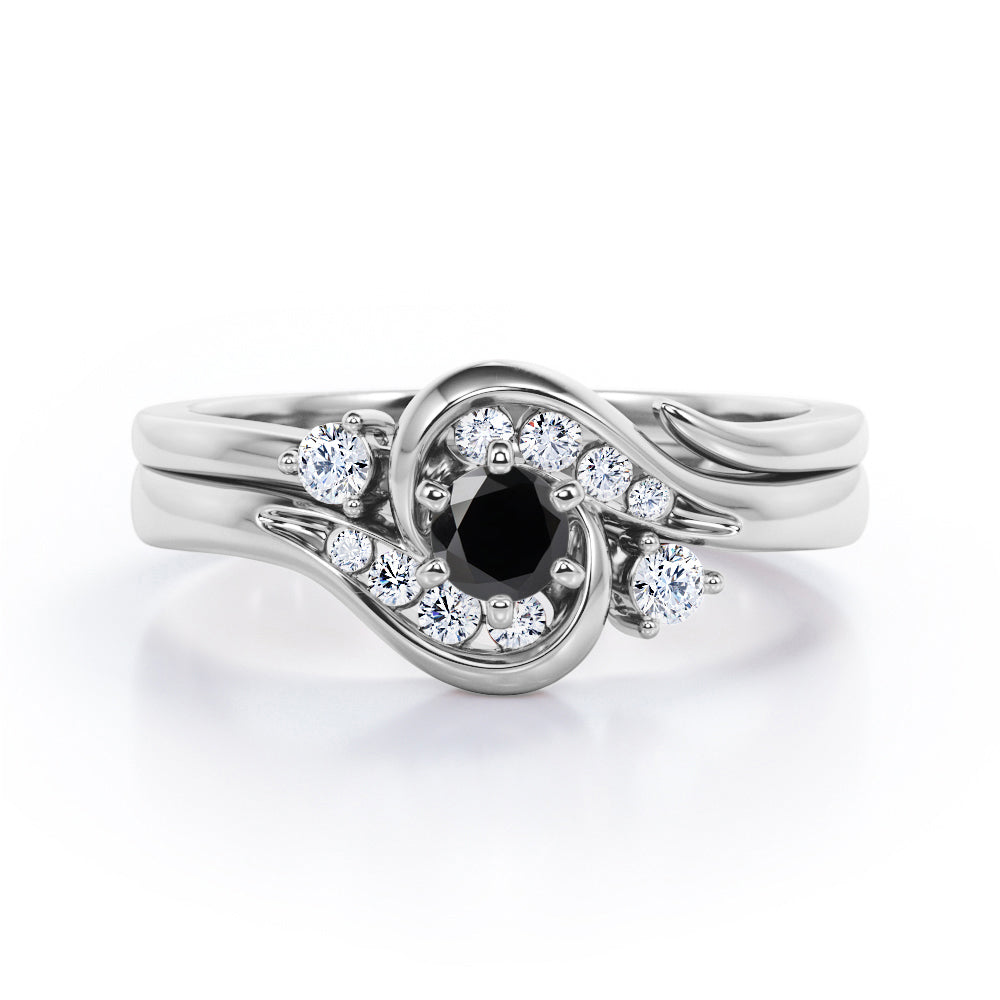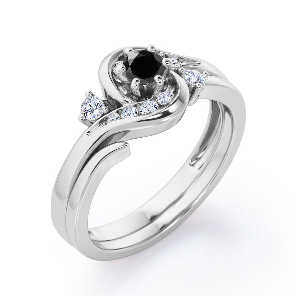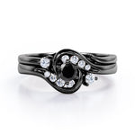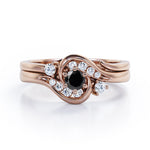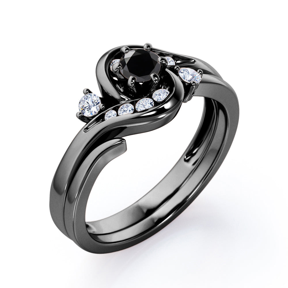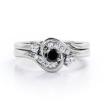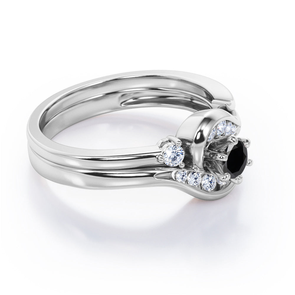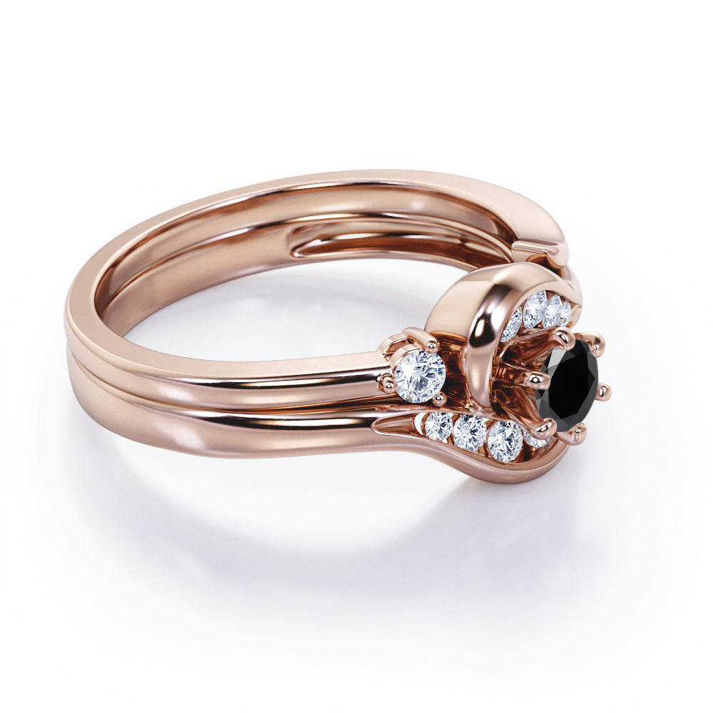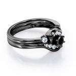 Two is sometimes better than one. The engagement ring can only be sold alone and already looks unique but with an additional wedding band, the ring is more complete. A 0.5 carat round Black diamond is placed in six prongs and is wrapped by curved bands. Each side of the shank acts like a hook that grabs and protect the stone; it is adorned by eight different sizes round Moissanite for silver ring and diamonds for gold ring. The rest on the engagement ring band is plain as well as the wedding band. However, once they are worn together, they will compliment each other and makes the ring looks absolutely stunning. The open shank wedding band features two round dainty Moissanite that locks perfectly at the side of center stone. You can choose either 18k gold over silver, 10k gold or 14k gold to be the metal of your ring with 4 colors; white gold, rose gold, yellow gold and black gold.