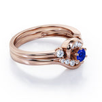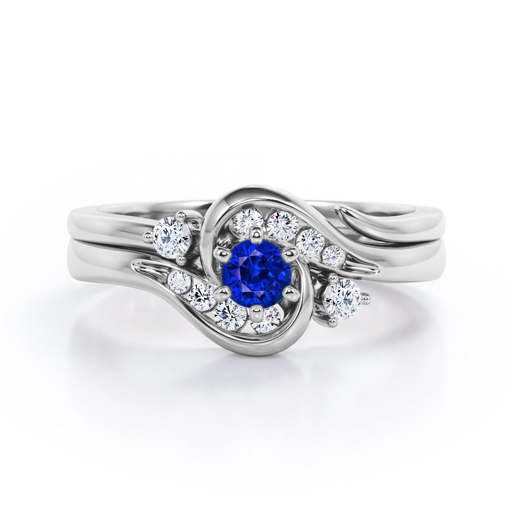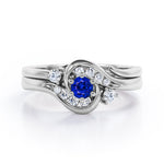 Two is sometimes better than one. The engagement ring can only be sold alone and already looks unique but with an additional wedding band, the ring is more complete. A 0.5 carat round Blue Sapphire is placed in six prongs and is wrapped by curved bands. Each side of the shank acts like a hook that grabs and protect the stone; it is adorned by eight different sizes round Moissanite for silver ring and diamonds for gold ring. The rest on the engagement ring band is plain as well as the wedding band. However, once they are worn together, they will compliment each other and makes the ring looks absolutely stunning. The open shank wedding band features two round dainty Moissanite that locks perfectly at the side of center stone. You can choose either 18k gold over silver, 10k gold or 14k gold to be the metal of your ring with 4 colors; white gold, rose gold, yellow gold and black gold.