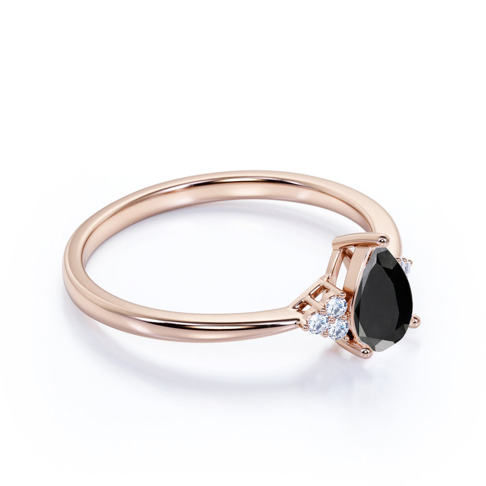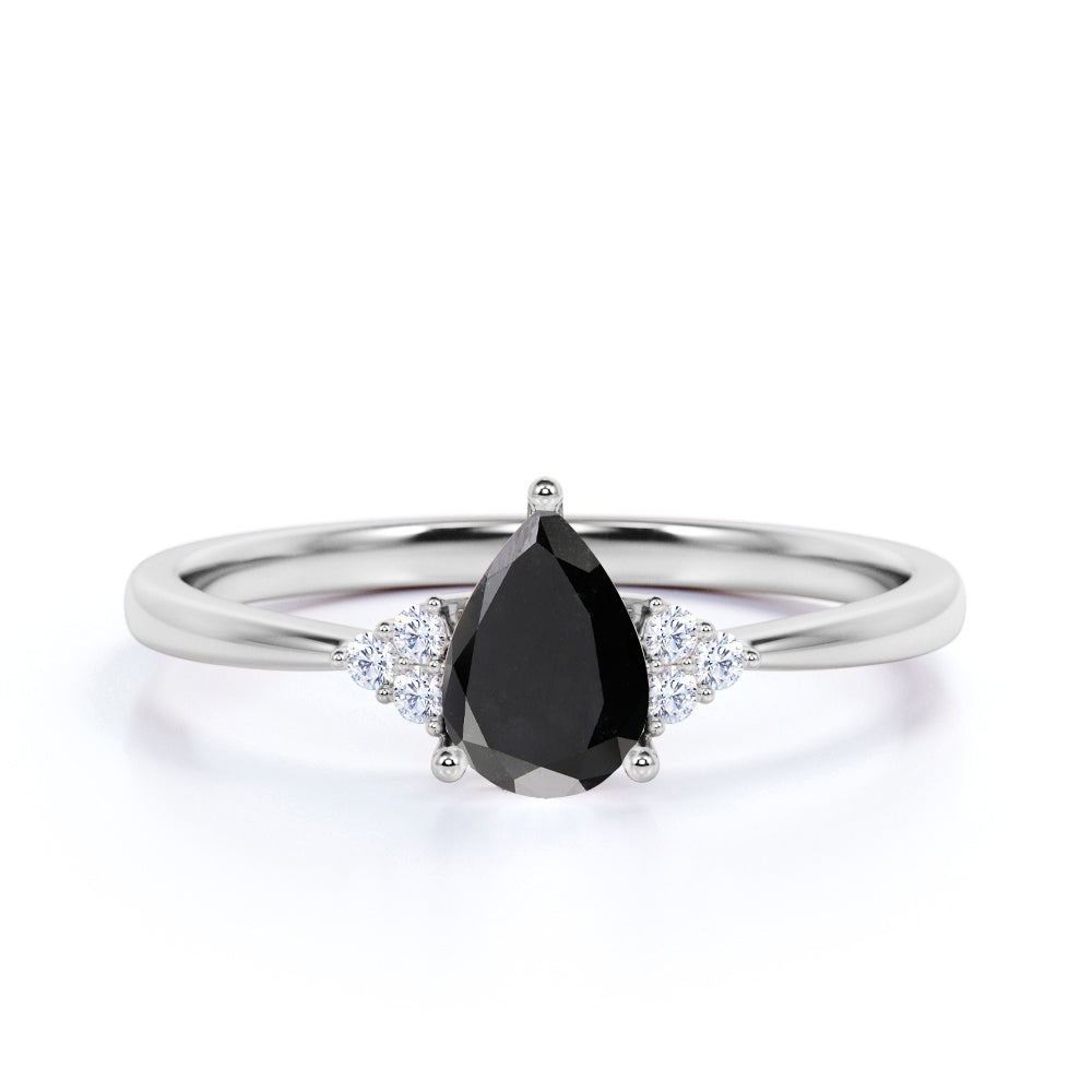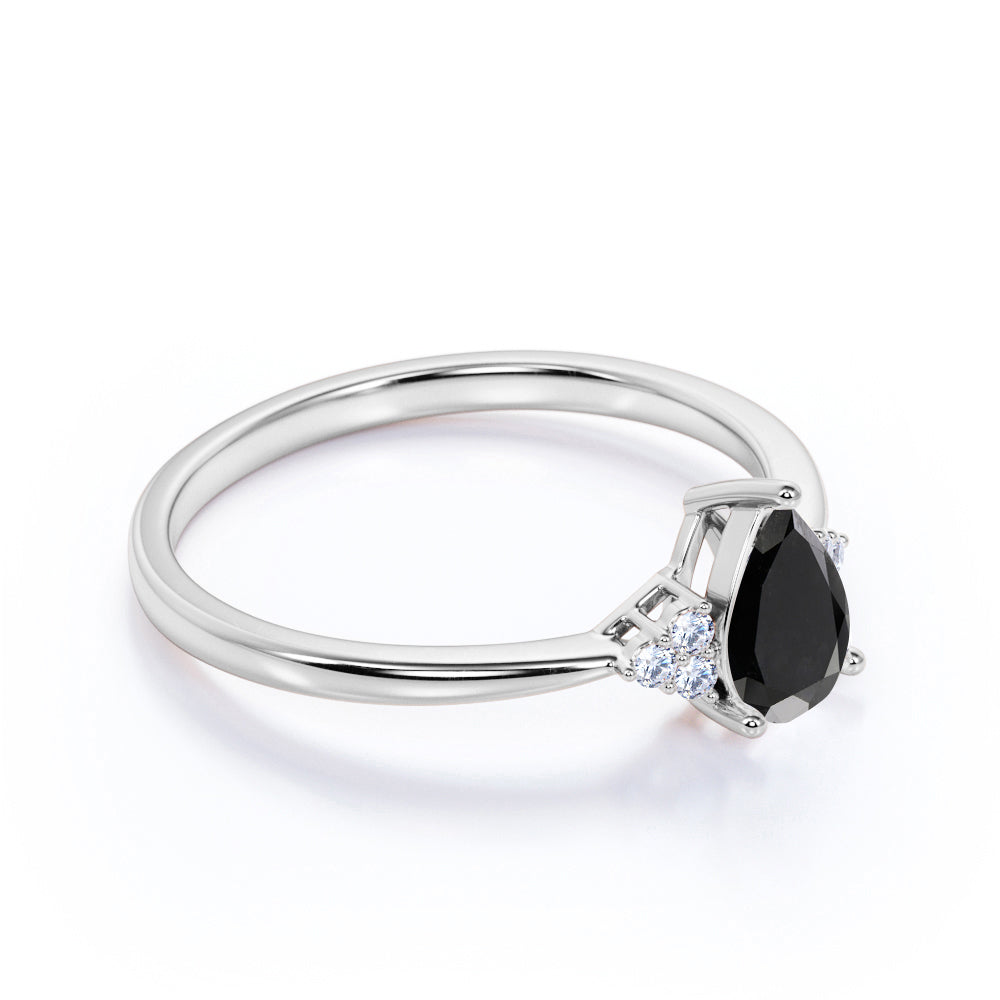 This trendy black diamond ring is so beautiful and durable despite its dainty look. If you are done with all the unnecessary crazy design, this minimalist black diamond ring is for you. We can also customize this black diamond engagement ring to become an infinity or eternity band which will reflects your love for each other and that love will surely last forever because of this amazing ring. This black diamond ring features an approximately 1 carat teardrop shape lab created black diamond, surrounded by .15 carat genuine side diamonds, for a total weight of 1.15 carats.