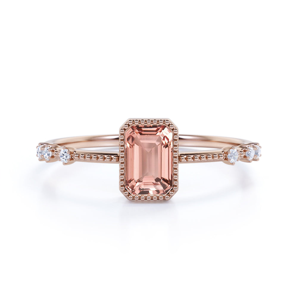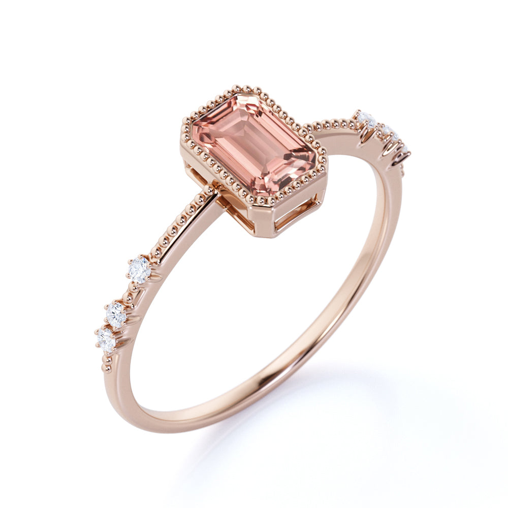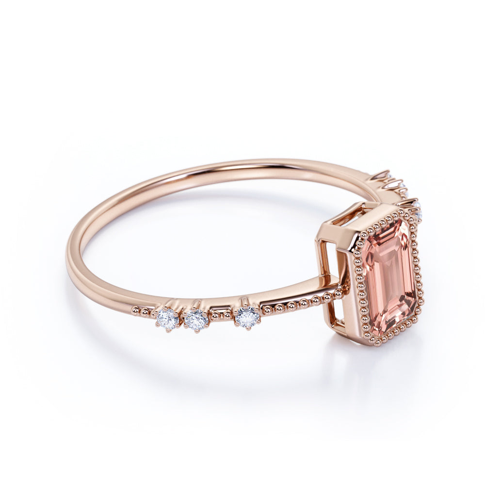 7 Stone Design 1.25 Carat Emerald Cut Australian Morganite and Diamond Vintage Engagement Ring in Rose Gold
