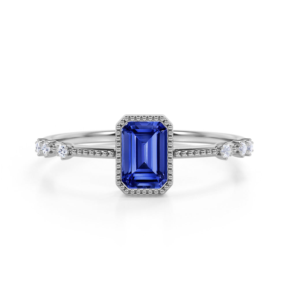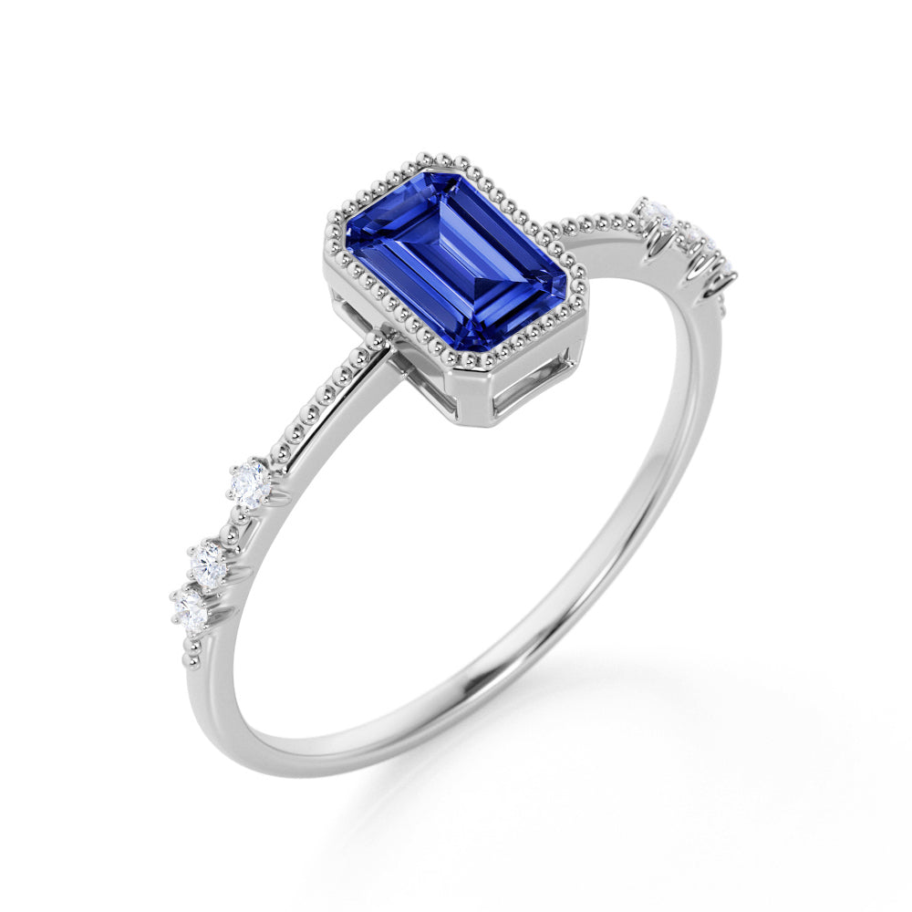 Perfect for any occasion, birthday gift, anniversary gift, promise ring or just a simple gift for your loved ones. This blue sapphire ring is also considered the new vintage art deco engagement ring, because of its art deco style that is unique and one of a kind ring design. This sapphire ring features an approximately 1 carat emerald cut natural sapphire, surrounded by .25 carat authentic diamond accent, for a total weight of 1.25 carats.