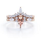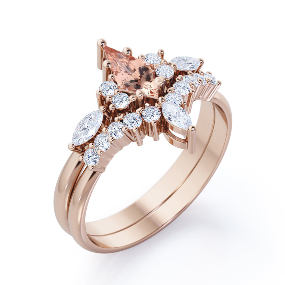Elegance as much as it can be, a 7 Stone Ring - 0.65 carat Kite Morganite and Moissanite Bridal Ring Set in Rose Gold glistens all the way to her hand. The engagement ring features a 0.5 carat kit Morganite with two round Moissanite and marquise Moissanite on each side of it. A contoured wedding band comes in the set and it is garnished by marquise Moissanite on top. Round Moissanite cascade down along the band. The wedding ring set can be made in 18k gold over silver, 10k gold and 14k gold with the color of white gold, rose gold and black gold.
