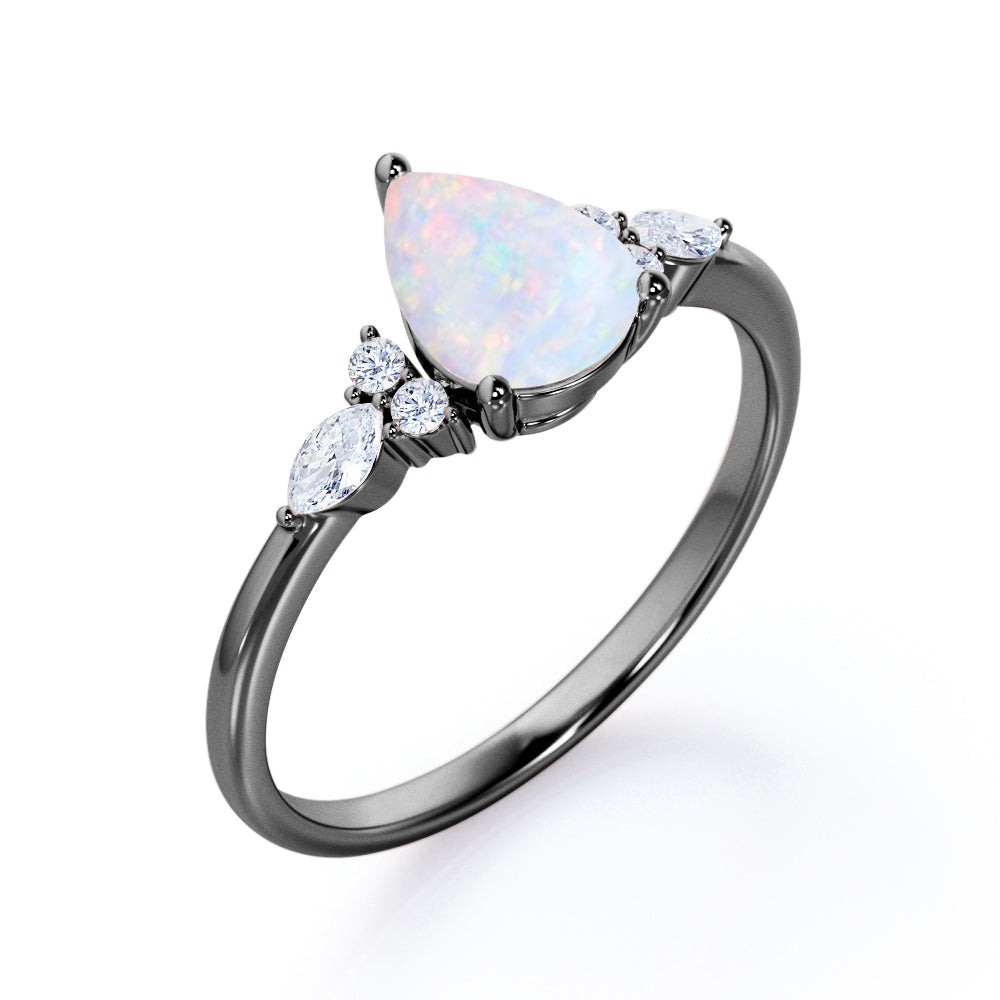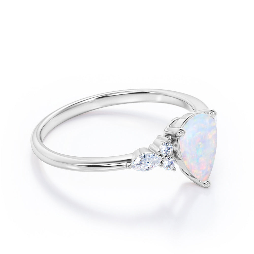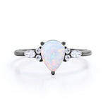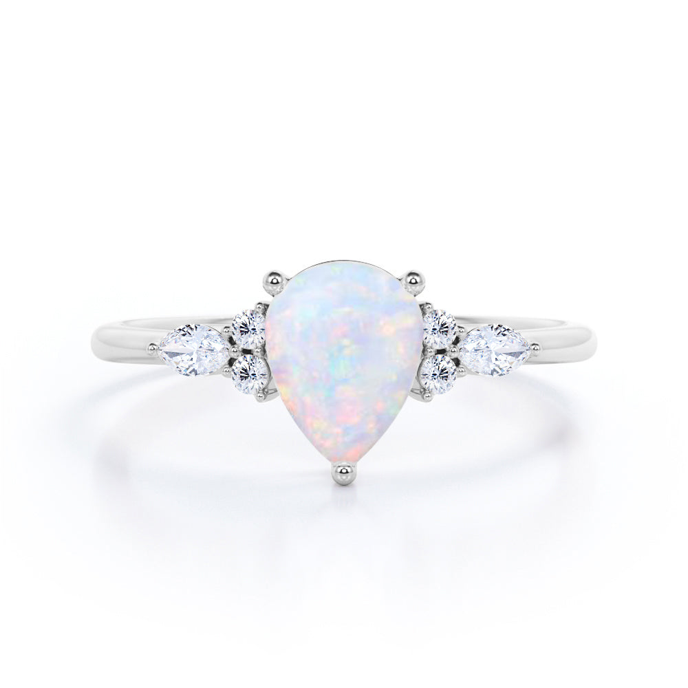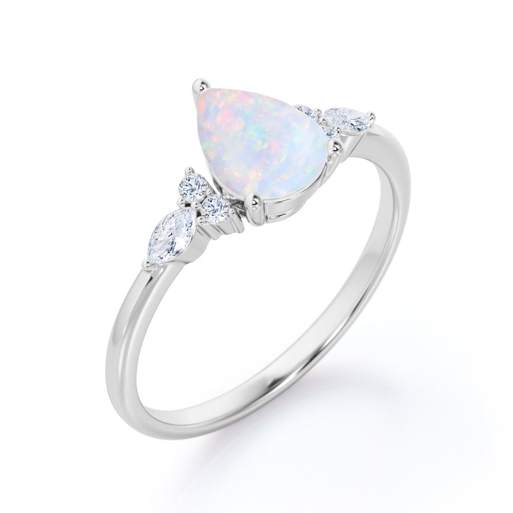 Affordable 1.35 Carat Tear Drop White Opal And Diamond Seven Stone Engagement Ring In White Gold. A more traditional look at a lower price point, this pear-cut solitaire opal engagement ring is a magnificent piece. This seven stone natural opal and diamond engagement ring is full of rich tones. The plain white gold band offers a delicate and feminine detail, while the trio set of round and marquise cut diamonds on the either side of the ring adds a bold aesthetic. The three prongs holds the center opal of 1 carat on its place surrounded by 0.35 carat of white bright diamonds. This affordable 1.35 carat tear drop white opal and diamond seven stone engagement ring in white gold can also be made in 18k Gold plating over silver, 10k Gold or 14k Gold as you desire. Without further delay, add it to your cart now to make this statement piece yours forever.