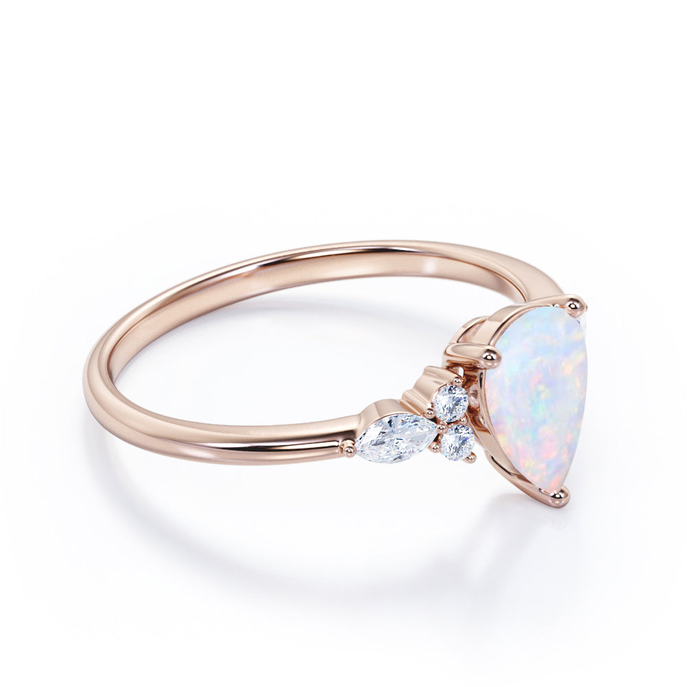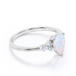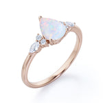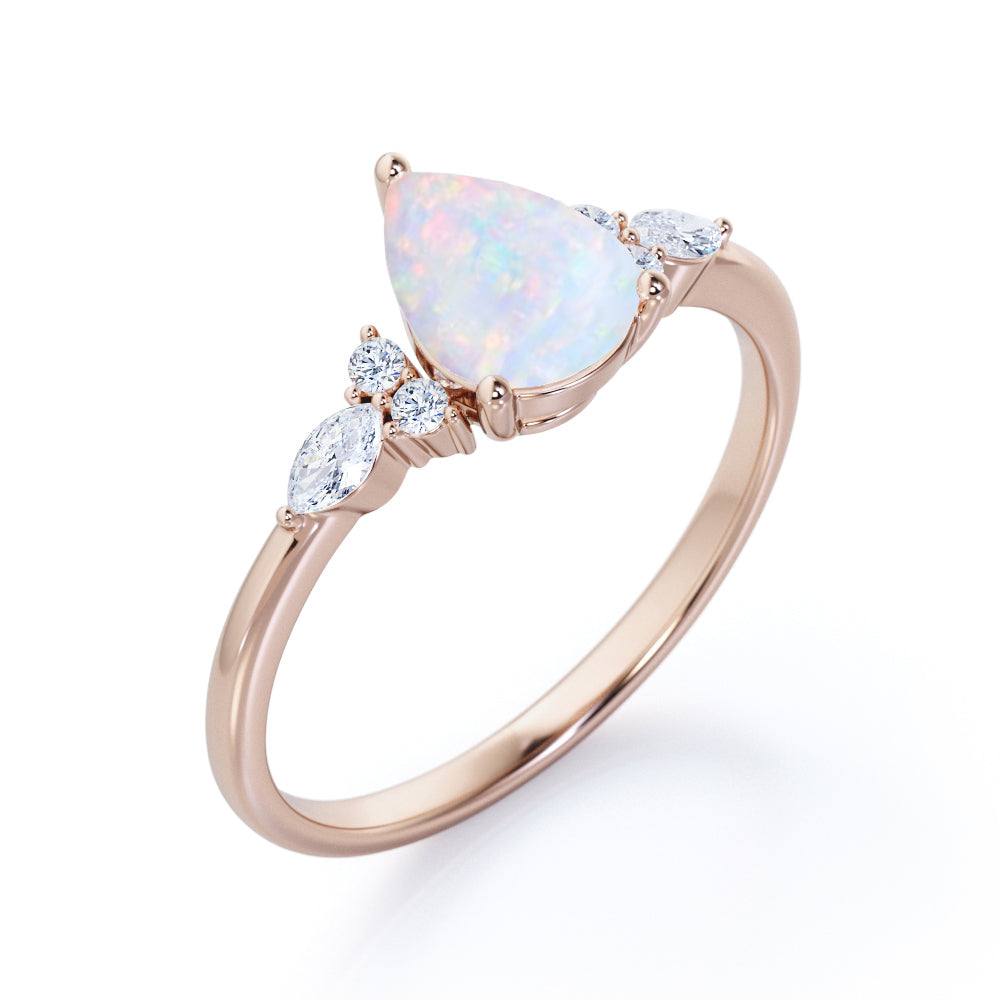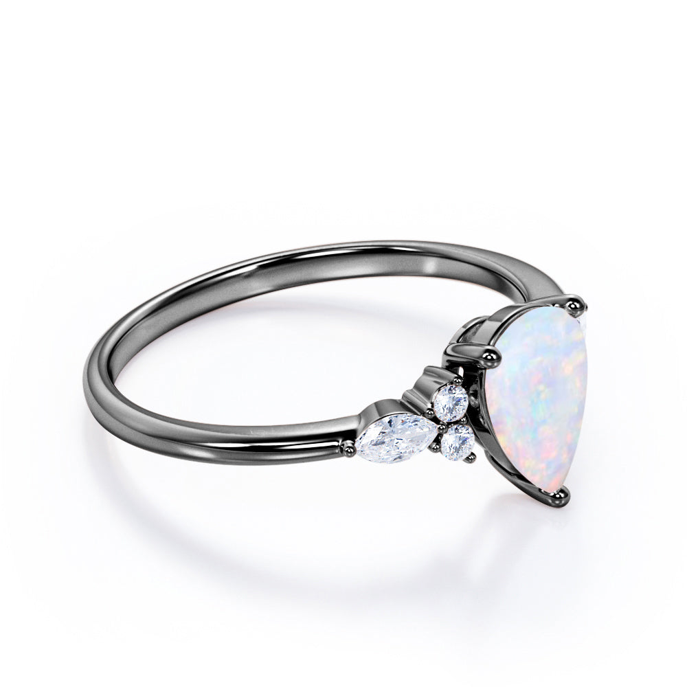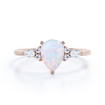 Affordable 1.35 Carat Tear Drop White Opal And Diamond Seven Stone Engagement Ring In White Gold. A more traditional look at a lower price point, this pear-cut solitaire opal engagement ring is a magnificent piece. This seven stone natural opal and diamond engagement ring is full of rich tones. The plain white gold band offers a delicate and feminine detail, while the trio set of round and marquise cut diamonds on the either side of the ring adds a bold aesthetic. The three prongs holds the center opal of 1 carat on its place surrounded by 0.35 carat of white bright diamonds. This affordable 1.35 carat tear drop white opal and diamond seven stone engagement ring in white gold can also be made in 18k Gold plating over silver, 10k Gold or 14k Gold as you desire. Without further delay, add it to your cart now to make this statement piece yours forever.