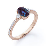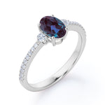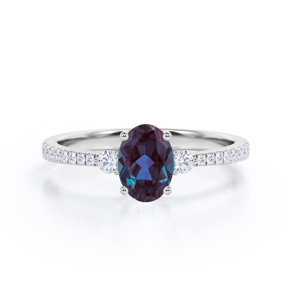 Affordable 1.40 Carat Oval Cut Lab Created Alexandrite And Diamond Four Prong Pave Engagement Ring In White Gold. Diamonds might be forever, but few gemstones are as mysteriously compelling as alexandrite, making it the perfect unique engagement ring option. Subtle yet striking, this oval cut lab created alexandrite and diamond ring is impossibly romantic. Featuring two sparkling round diamonds on the side of the center stone which is lab made alexandrite with the hues of purple, makes this one-of-a-kind ring more desirable. This pave set ring comprises of 1 carat alexandrite as the center stone and is surrounded by 0.40 carat of shimmering white diamonds. This four pronged alexandrite engagement ring is set on a micro pave set band in white gold. Handmade with detailed attention and deep love, this affordable 1.40 carat oval cut lab created alexandrite and diamond four prong pave engagement ring in white gold can also be customized to 18k Gold plating over silver, 10k Gold or 14k Gold or 18k Gold as per your choice.