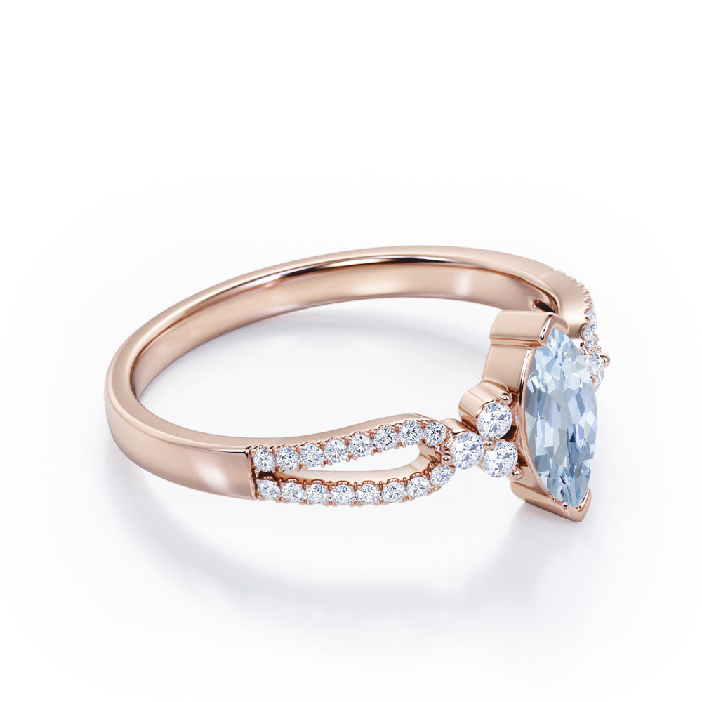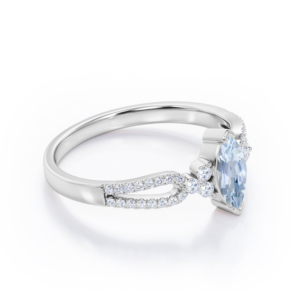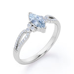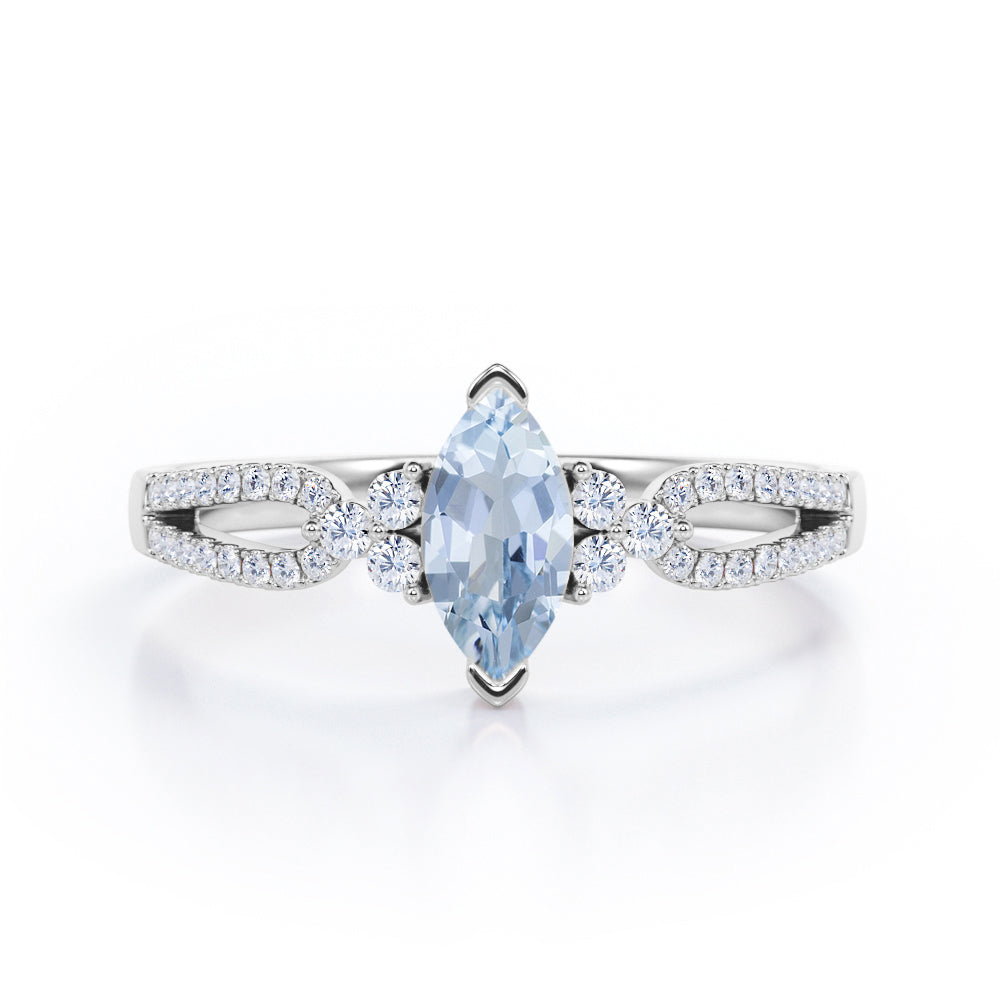 Affordable 1.45 Carat Marquise Cut Aquamarine And Diamond Double Shank Engagement Ring In White Gold. Set with three round shaped white diamonds on both sides, this ring is sure to make a statement in the most subtle and classic way. One carat aquamarine sits on a two prong setting for a modern take on the classic ring followed by 0.45 carat of side diamonds. The brilliant side stones and the double shank in this aquamarine and diamond ring adds a certain charm to this alluring piece. This affordable 1.45 carat marquise cut aquamarine and diamond double shank engagement ring in white gold can also be customized to 18k Gold plating over silver, 10k Gold or 14k Gold as you desire. This is a one-of-a-kind piece so if it strikes your eye, grab it while you can. Please note that if the ring is made over silver, the side stone will be moissanite and if it is made on gold, diamond will be employed as the side stone.