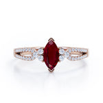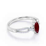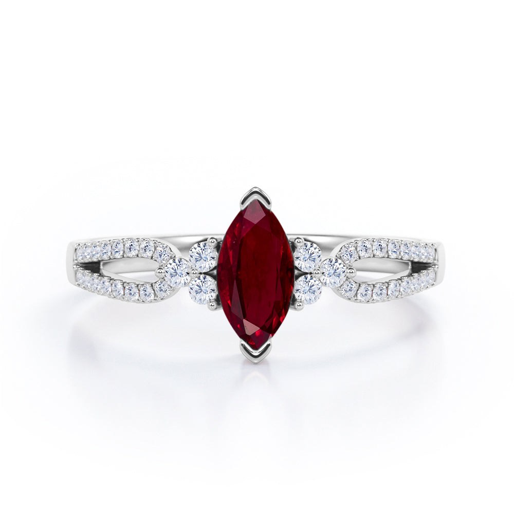 Affordable 1.45 Carat Marquise Cut Lab Ruby And Diamond Double Shank Engagement Ring In White Gold. Set with three round shaped white diamonds on both sides, this ring is sure to make a statement in the most subtle and classic way. One carat Lab Ruby sits on a two prong setting for a modern take on the classic ring followed by 0.45 carat of side diamonds. The brilliant side stones and the double shank in this Lab Ruby and diamond ring adds a certain charm to this alluring piece. This affordable 1.45 carat marquise cut Lab Ruby and diamond double shank engagement ring in white gold can also be customized to 18k Gold plating over silver, 10k Gold or 14k Gold as you desire. This is a one-of-a-kind piece so if it strikes your eye, grab it while you can. Please note that if the ring is made over silver, the side stone will be moissanite and if it is made on gold, diamond will be employed as the side stone.
