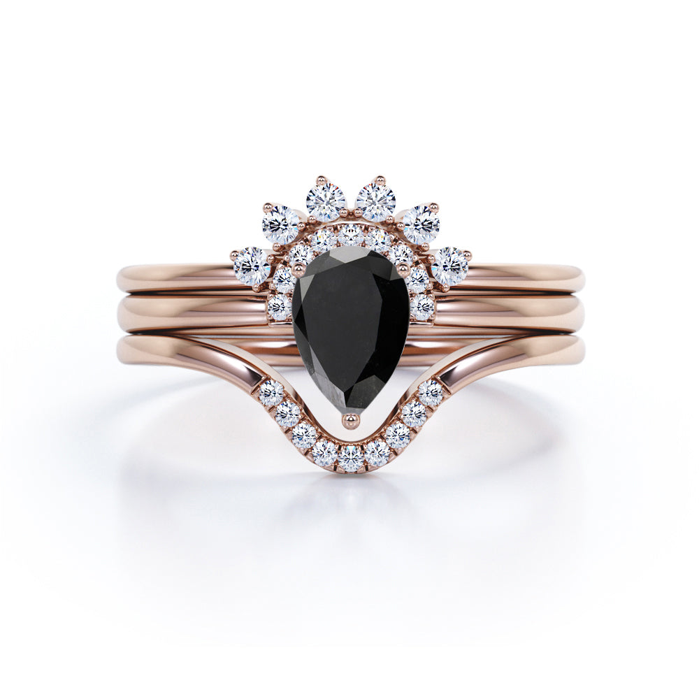 Dainty 1.35 Carat Pear cut Lab Black Diamond Antique Wedding Trio Ring Set in Rose Gold