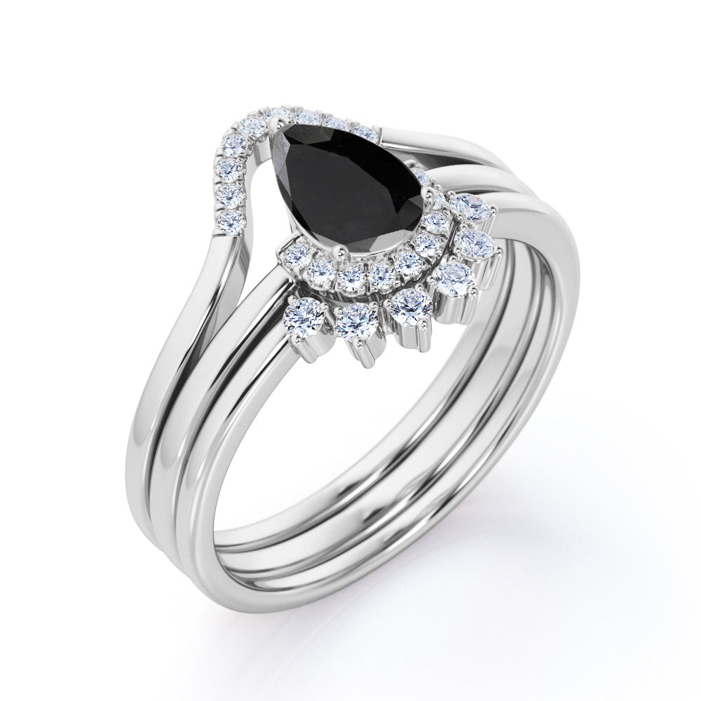 Dainty 1.35 Carat Pear cut Lab Black Diamond Antique Wedding Trio Ring Set in Rose Gold. This is a beautiful antique black Diamond wedding ring set with engagement ring and wedding bands showcases total 1.35 carats perfect lab created black diamond and glittering diamonds and is made in solid 10k Rose Gold. The piece is handmade, for a refreshingly beautiful and unique look, away from the ordinary. And as always, the order comes with our 30 DAYS FULL REFUND policy, GUARANTEED DELIVERY within 5 Days, and in a BEAUTIFUL Jewelry Ring Box.