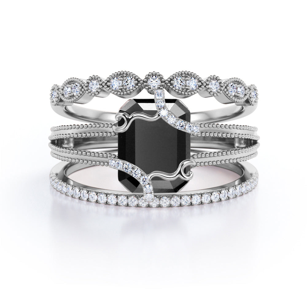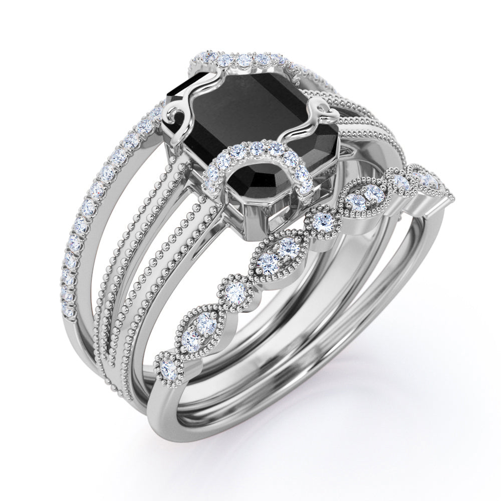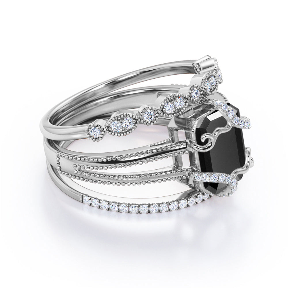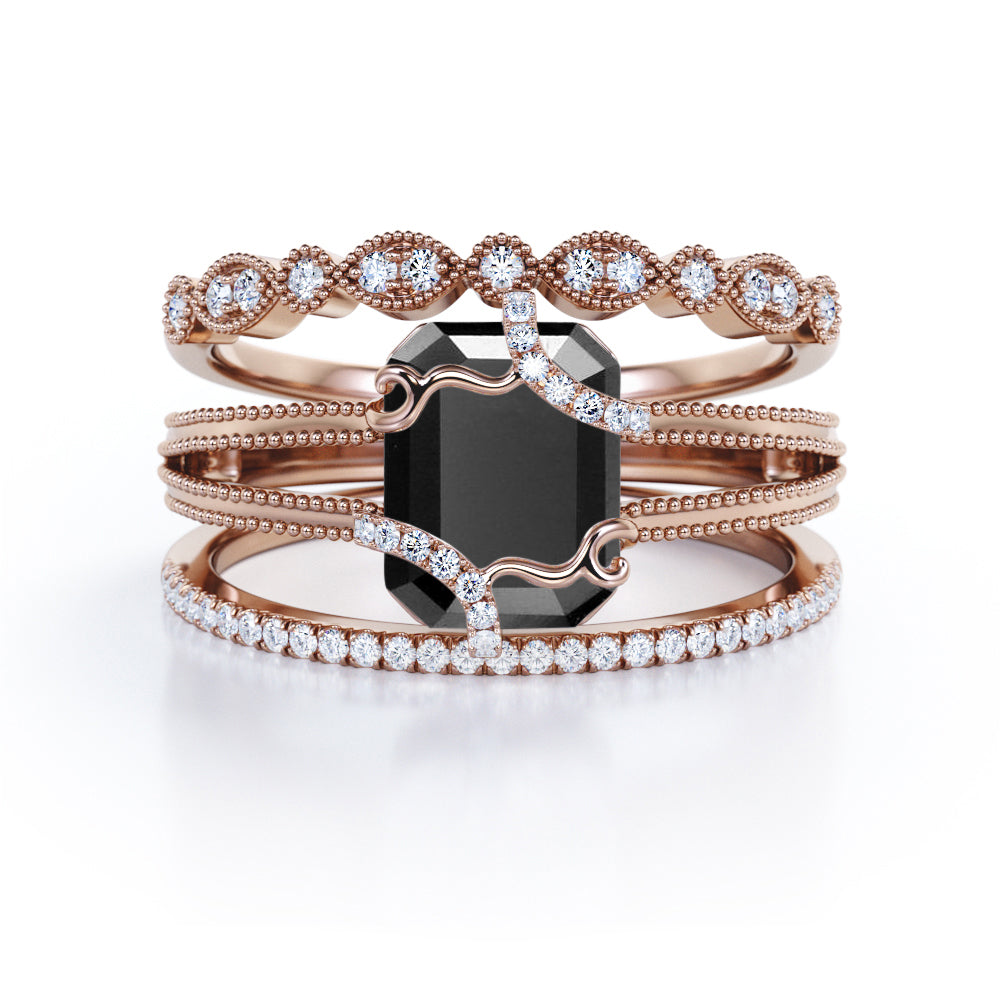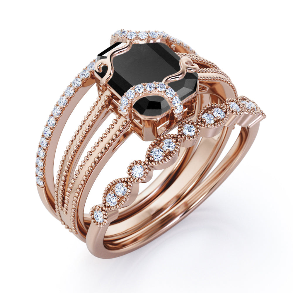 Affordable 1.50 Carat Emerald cut Lab Black Diamond Antique Wedding Trio Ring Set in Rose Gold