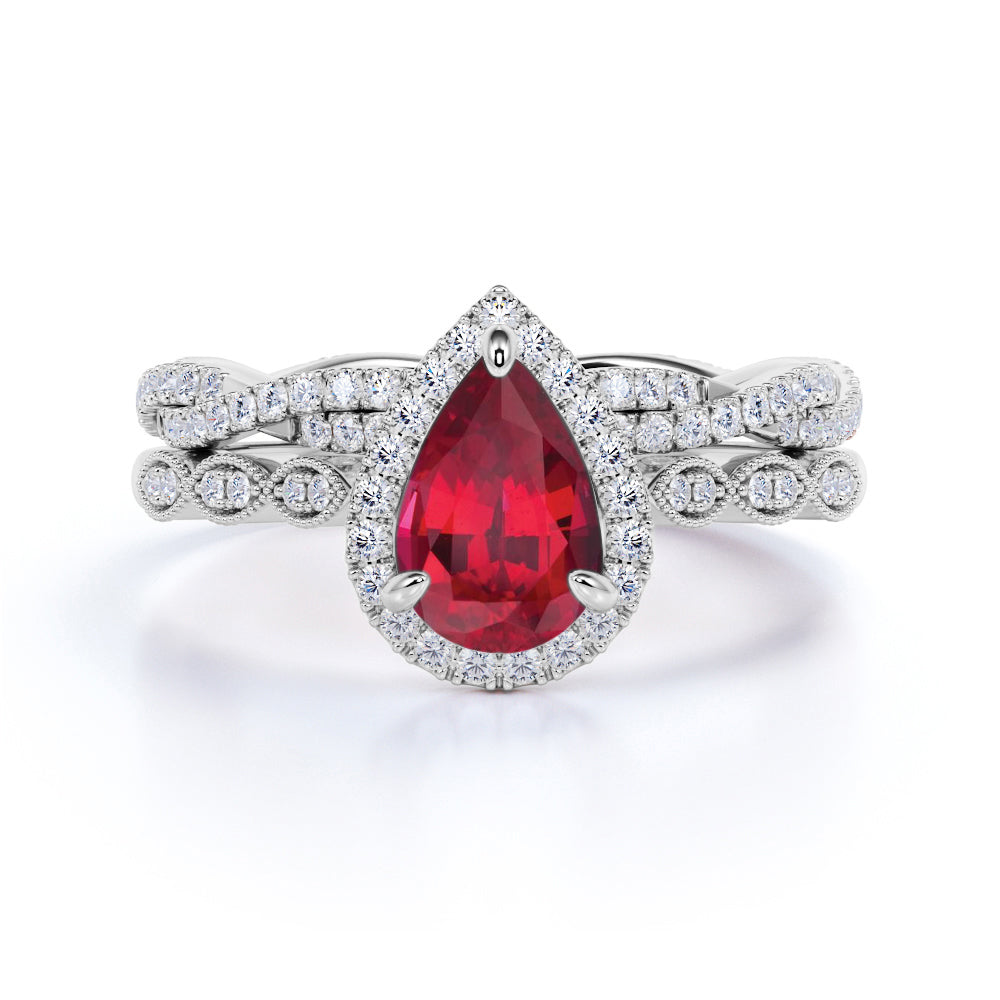 Affordable 2 Carat Pear cut Lab Ruby and Diamond Antique Wedding Ring Set in White Gold