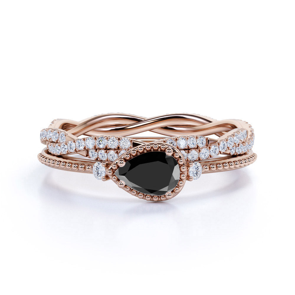 Affordable Antique Artdeco 1.60 Carat Pear Lab Black Diamond Halo Wedding Ring Set in Rose Gold