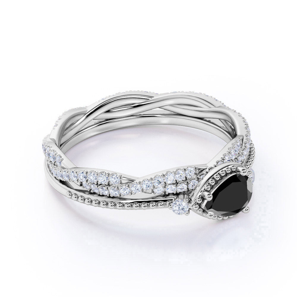 Affordable Antique Artdeco 1.60 Carat Pear Black Diamond Halo Wedding Ring Set in Rose Gold. Superbly crafted black Diamond wedding set with engagement ring and wedding bands showcases total 1.60 carats perfect lab created black diamond and glittering diamonds and is made in solid 10k Rose Gold. Handmade by our skilled artisan jeweler, this piece is truly one of a kind. And as always, the order comes with our 30 DAYS FULL REFUND policy, GUARANTEED DELIVERY within 5 Days, and in a BEAUTIFUL Jewelry Ring Box.