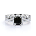 Affordable Antique Artdeco 2 Carat Cushion Cut Lab Black Diamond Halo Wedding Trio Ring Set in White Gold