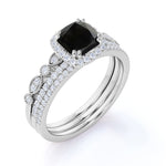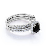 Affordable Antique Artdeco 2 Carat Round Black Diamond Halo Wedding Trio Ring Set in White Gold. This is a beautiful black Diamond affordable wedding ring set with engagement ring and wedding bands features 1 carat perfect lab created black diamond and 1 carat glittering diamonds and is made in solid 10k White Gold. Handmade ring for that unique and perfect look that is beautiful and extraordinary. And as always, the order comes with our 30 DAYS FULL REFUND policy and in a BEAUTIFUL Jewelry Ring Box.
