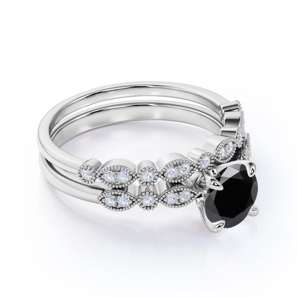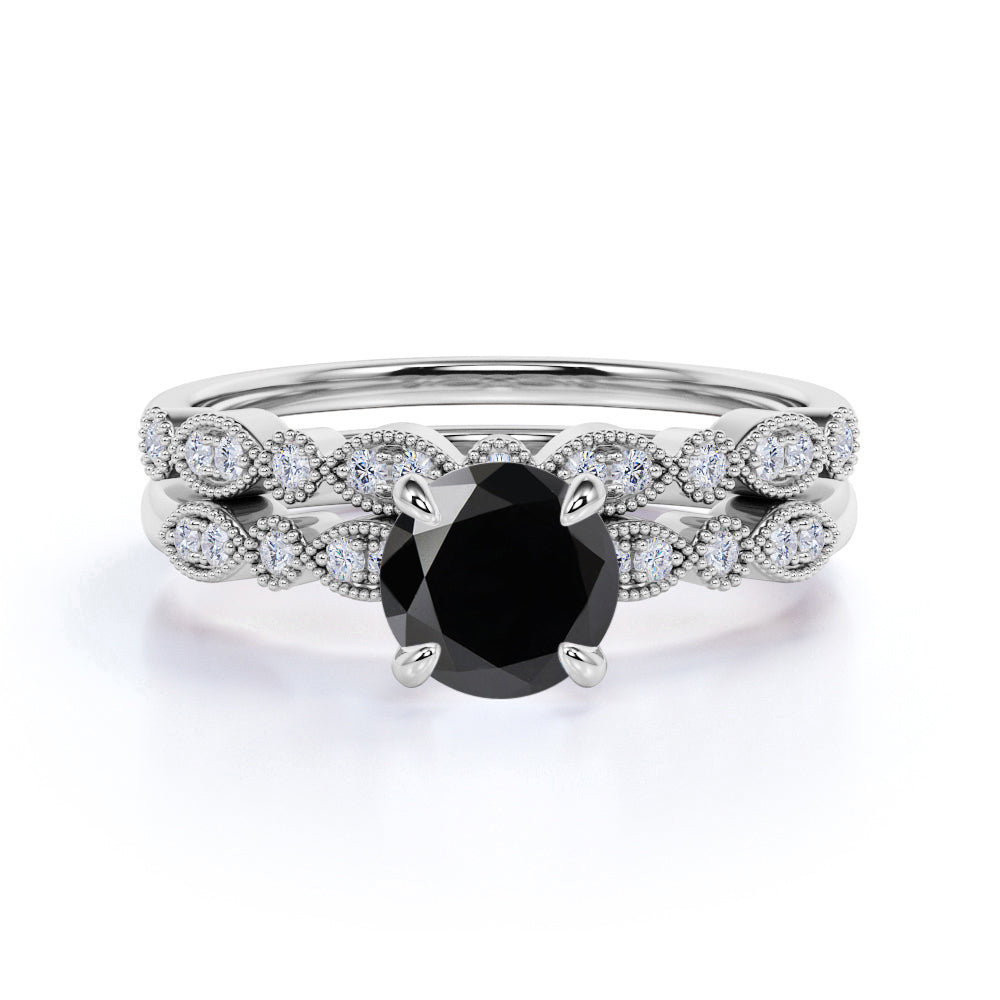 Affordable pair 1.50 Carat Black Diamond Antique Wedding Ring Set in White Gold. Affordable yet designer black Diamond affordable wedding ring set with engagement ring and wedding bands features 1 carat perfect lab created black diamond and 0.50 carat glittering diamonds and is made in solid 10k White Gold. This piece of jewelry is handmade, sporting quality craftsmanship that will last for years to come. And as always, the order comes with our 30 DAYS FULL REFUND policy, GUARANTEED DELIVERY within 5 Days, and in a BEAUTIFUL Jewelry Ring Box.