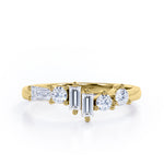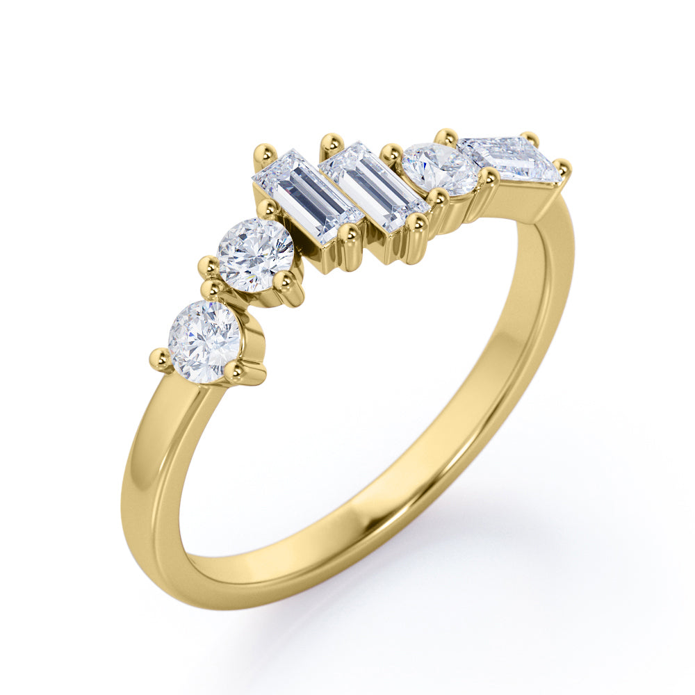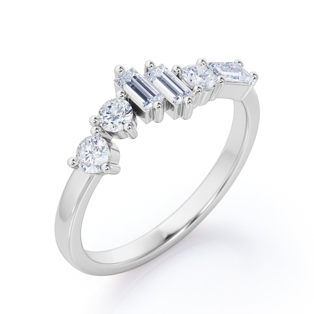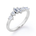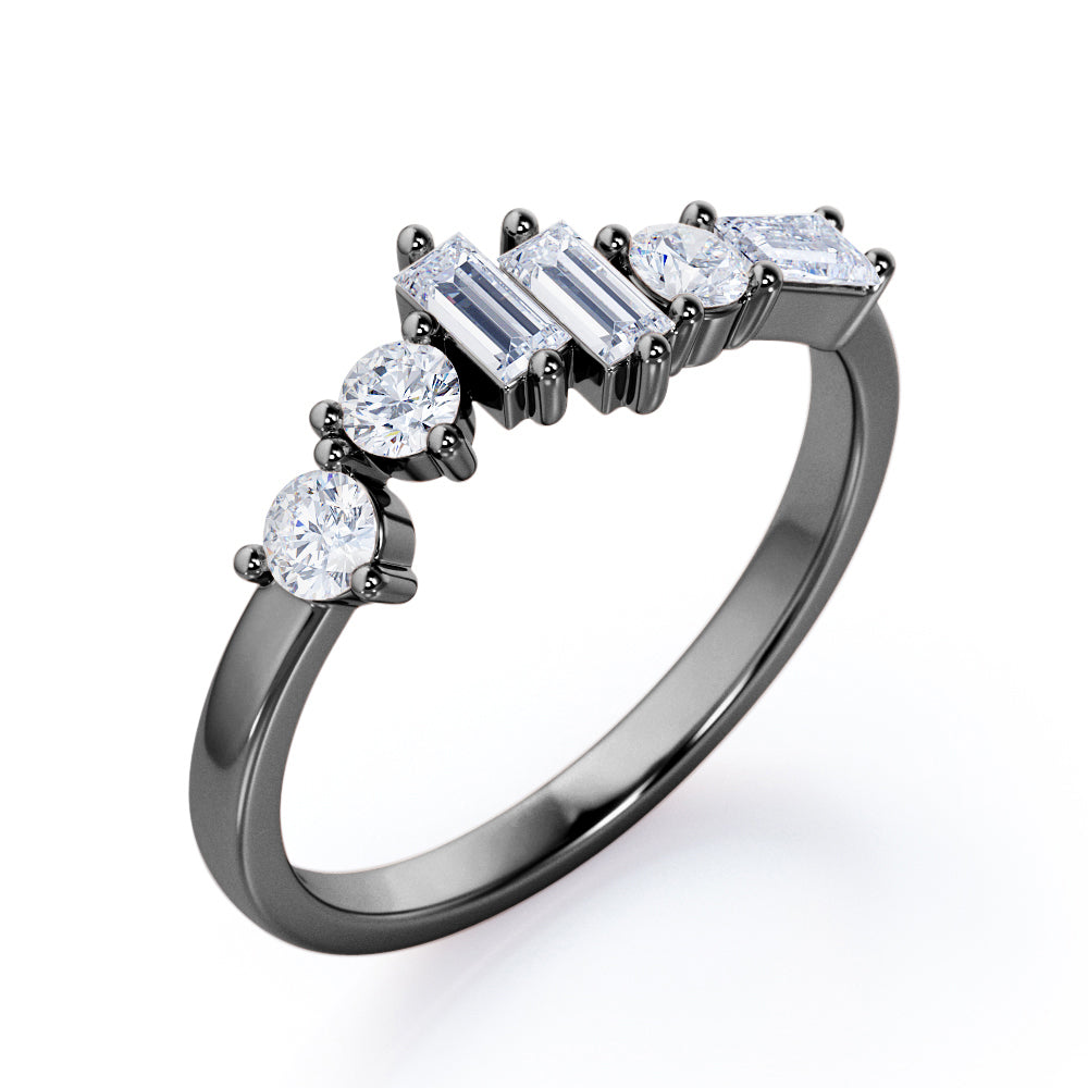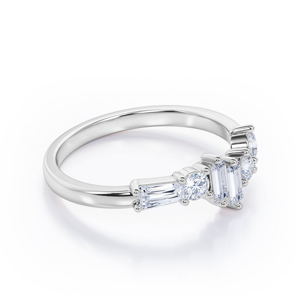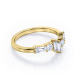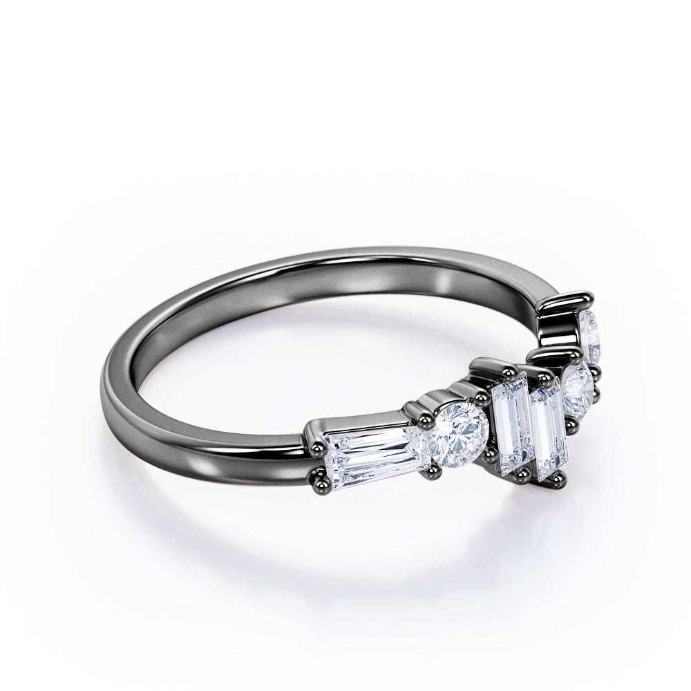 Be in style and unique with an Alternating Dainty Band 1.5 carat Baguette and Round Moissanite Wedding Band in Rose Gold. This dainty ring features three baguette Moissanite and three round Moissanite. All six pieces are placed in different level and manner; starting with dainty round stone at the same level with the band and another round which is placed slightly higher. Next to the second stone is two baguette stone in different height, then another round Moissanite and baguette Moissanite in east-west setting as the last one. The ring can be made to your choice of 18k gold over silver, 10k gold and 14k gold with the color of white gold, rose gold, yellow gold and black gold.