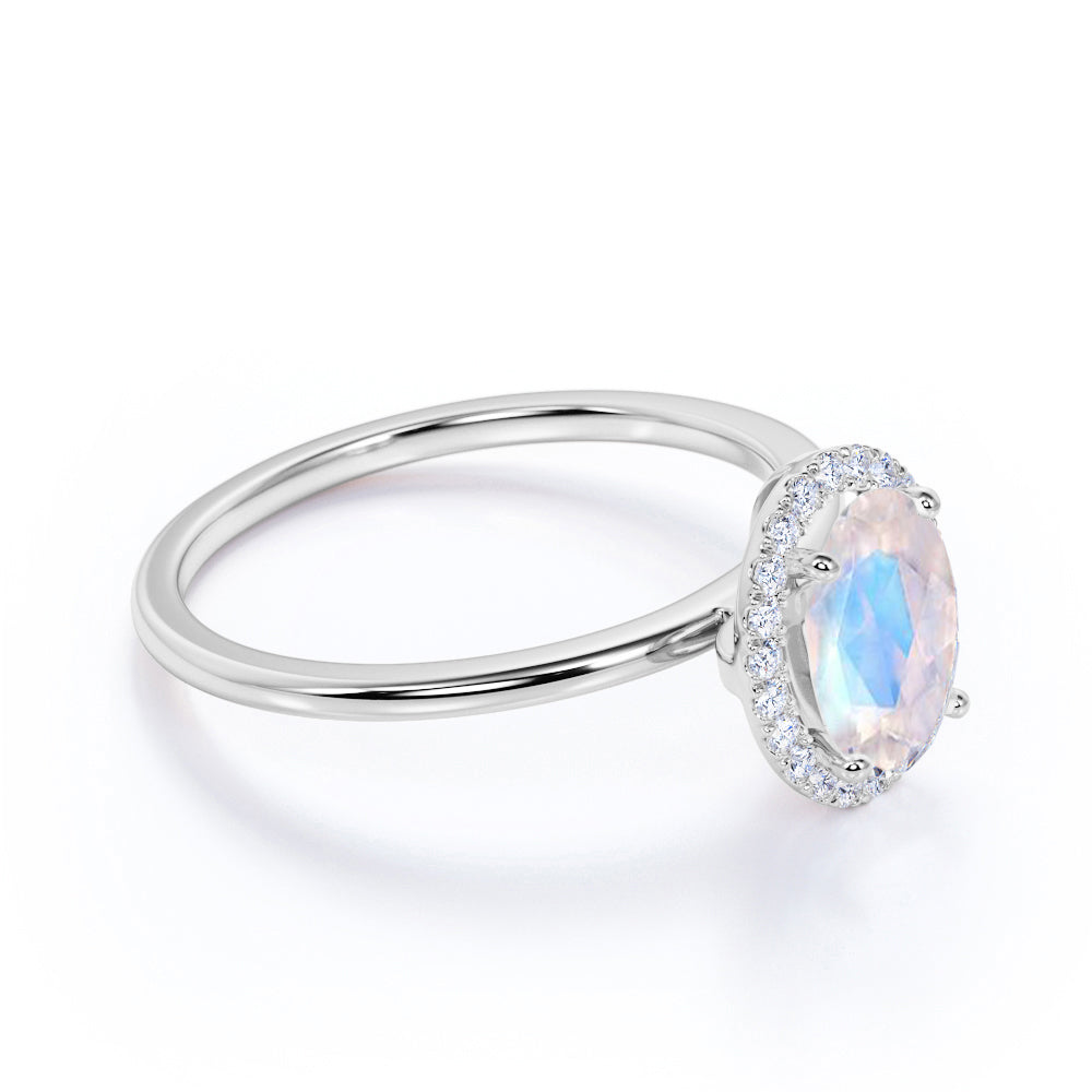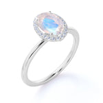 The colorful play of light from this blue moonstone and diamond halo engagement ring will surely put a sparkle in your eyes. This antique engagement ring features an approximately 1 carat oval cabochon cut natural blue moonstone in the center of the engagement ring, surrounded by .25 carat real diamonds for gold ring and moissanite for silver ring, for a total weight of 1.25 carats.