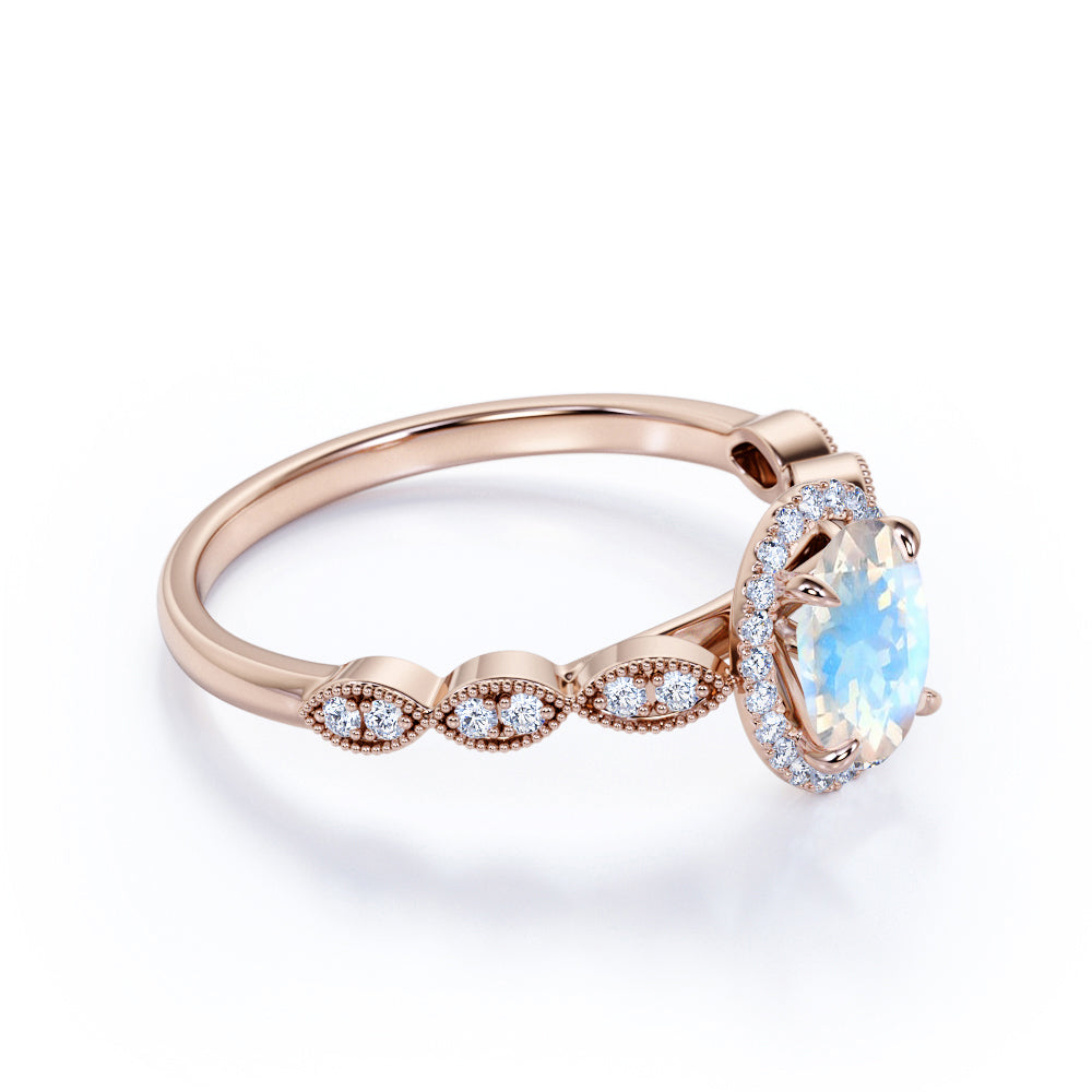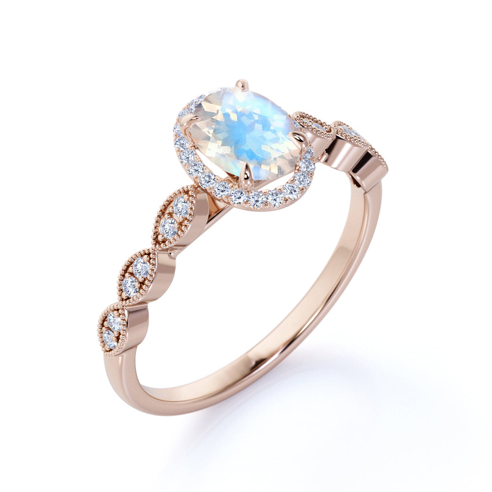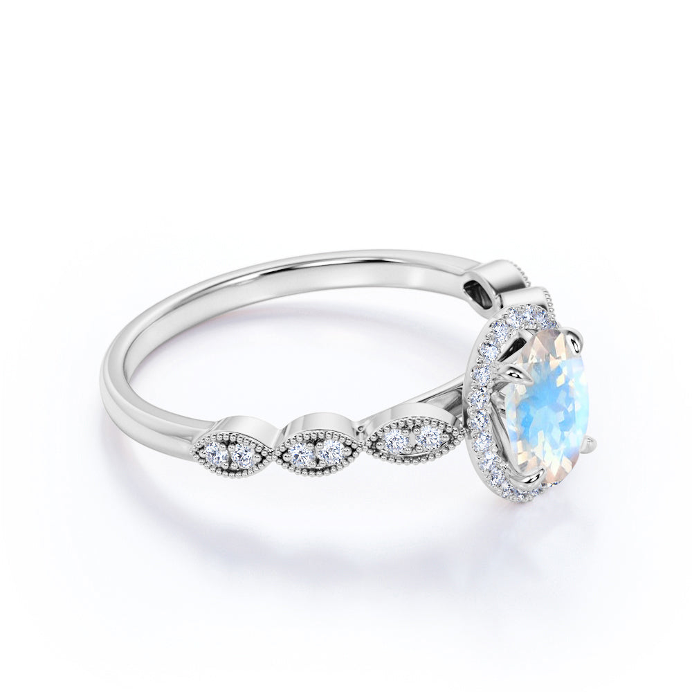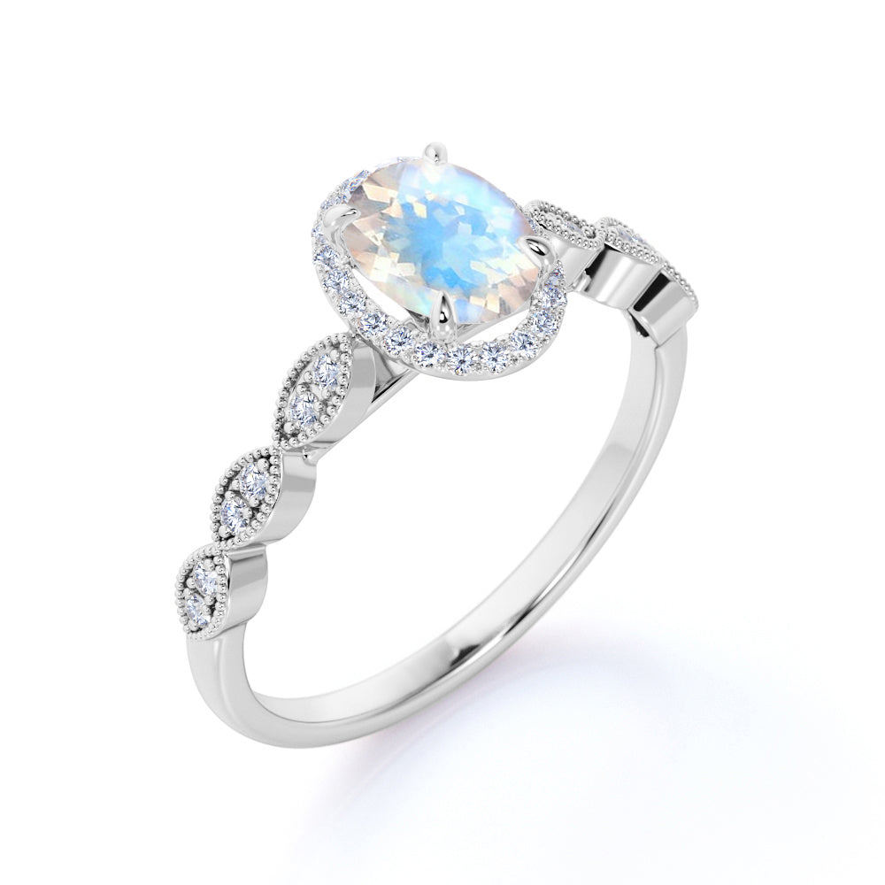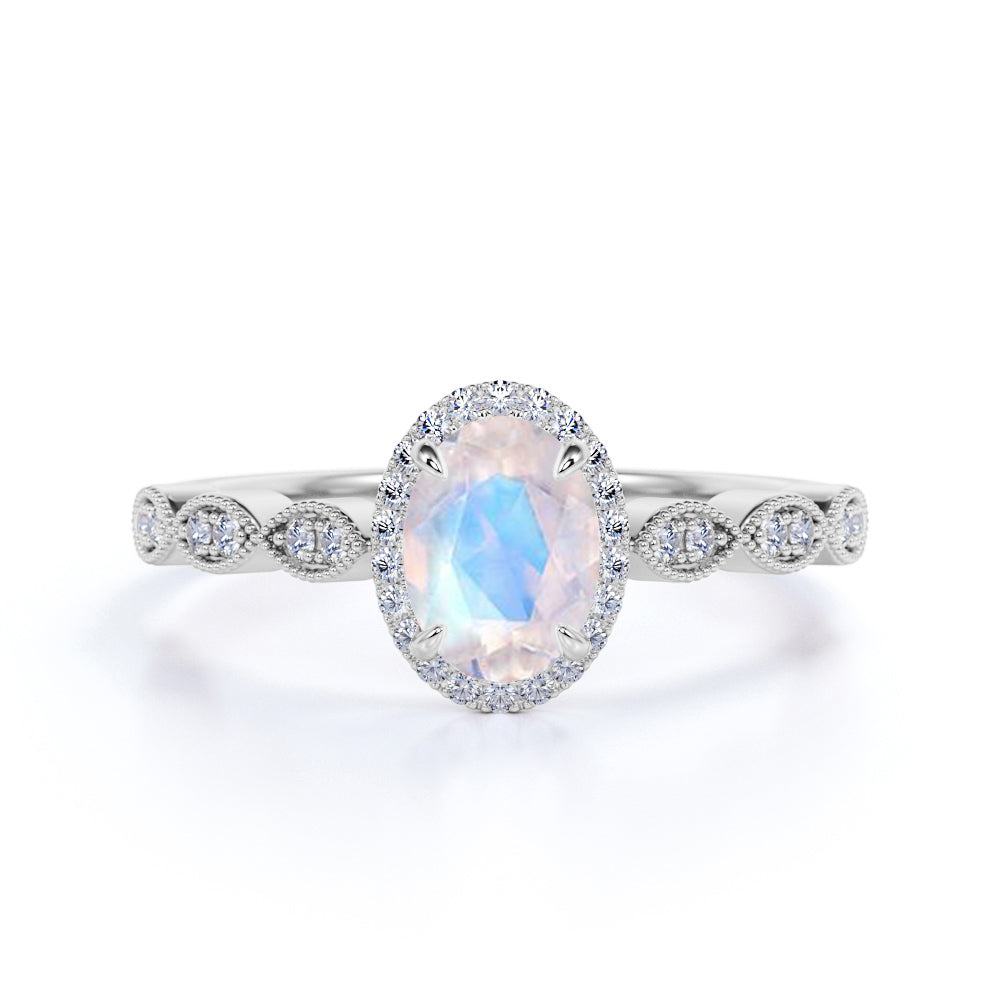 Refined with modern inspired design, this halo vintage ring for women makes the moment magical. Made with white gold, this ring for her features a total of 1.50 carat oval rainbow moonstone and real diamond side stones for gold ring and moissanite for silver ring. This classy and unique engagement ring expresses all the love you hold in your heart.
