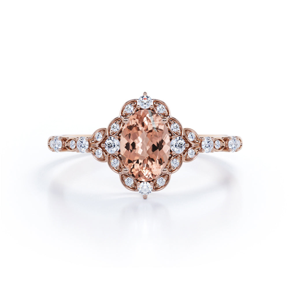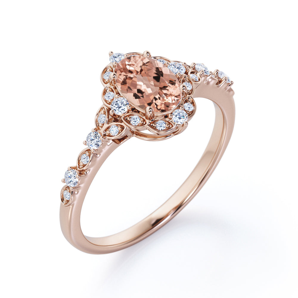 Antique 1.50 Carat Oval Cut Morganite and Diamond Engagement Ring in Rose Gold. This is a beautiful antique classic peach pink morganite wedding ring set features total 1.50 carats perfect peach pink morganite with glittering diamonds and is made in solid 10k Rose Gold. Break away from the generic look of mass-produced jewelry with this intricate handmade piece.