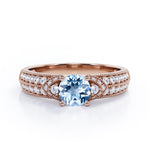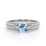 Antique 4 Prong 1.50 Carat Round Cut Aquamarine And Diamond Vintage Milgrain Layered Engagement Ring In White Gold. For the bold bride out there, we have got the one of a kind ring you've been searching for. Check out this stunner with a brilliant round aquamarine of 1 carat accented by 0.50 carat glistening set of diamonds all over the band. The vintage-inspired design is complemented by a vintage style thick layered wedding band embedded with antique milgrain all over in white gold. The vintage milgrain work all over the band gives this gorgeous aquamarine engagement ring an antique feel. This vintage beaded engagement ring is an epitome of timeless. The antique 4 prong 1.50 carat round cut aquamarine and diamond vintage milgrain layered engagement ring in white gold for her can also be customized to 18k Gold plating over silver, 10k Gold or 14k Gold as you like. Please note that if the ring is made over silver, the side stone will be moissanite and if it is made on gold, diamond will be employed as the side stone.