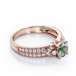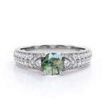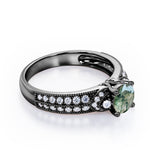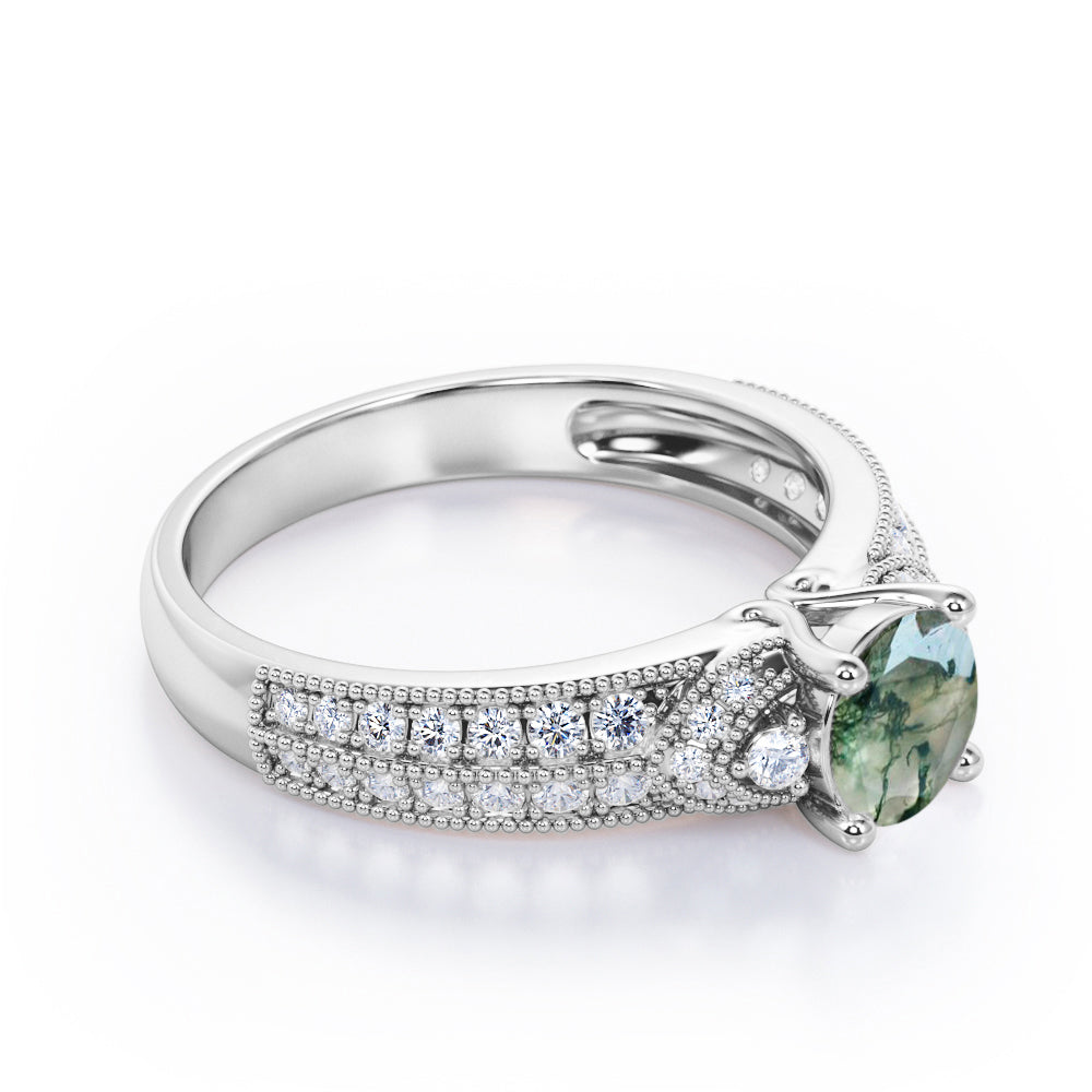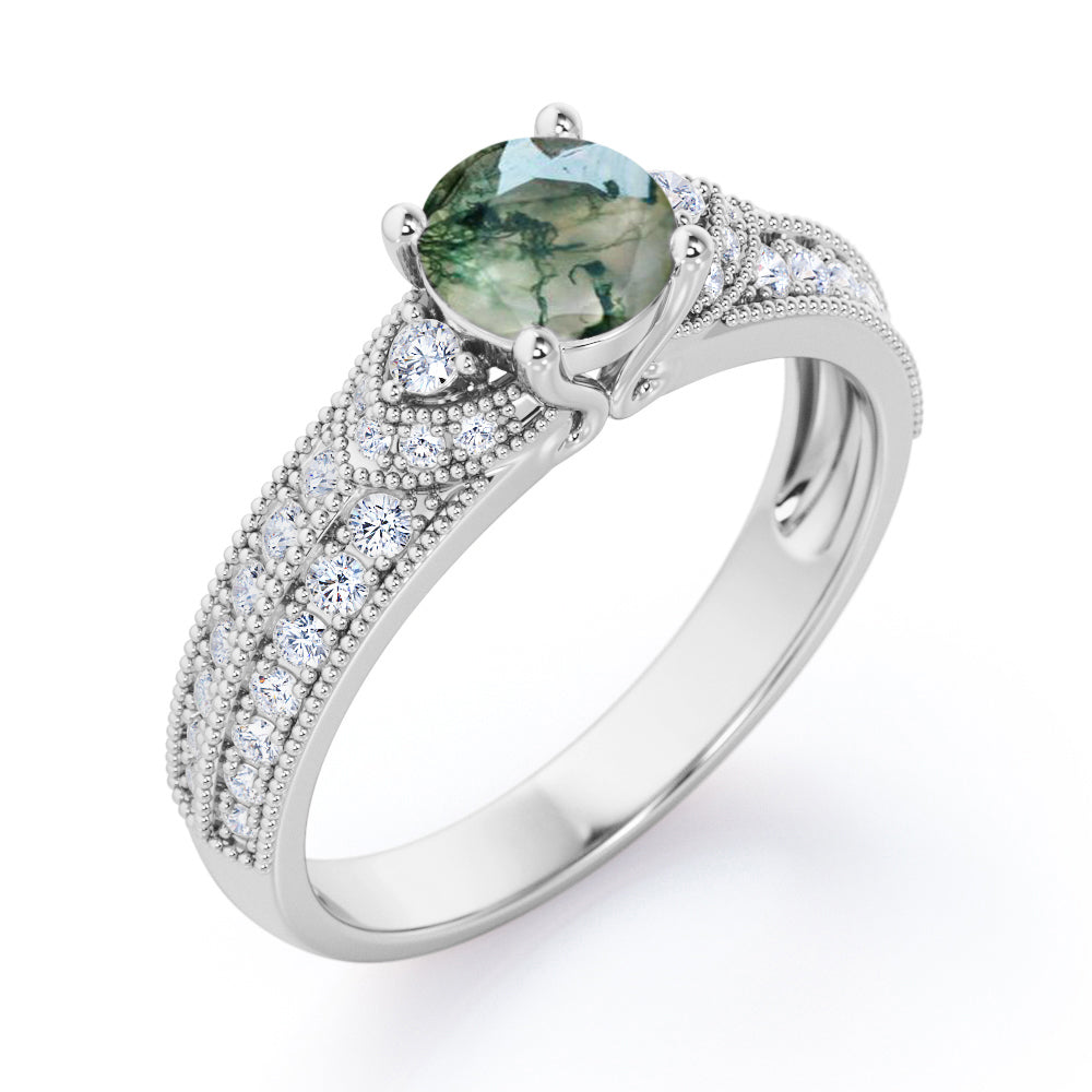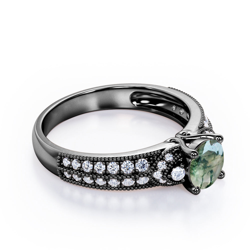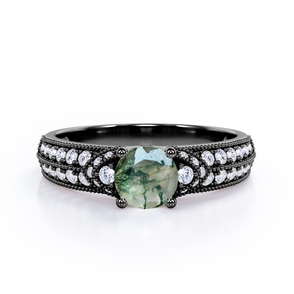 Antique 4 Prong 1.50 Carat Round Cut Green Moss Agate And Diamond Vintage Milgrain Layered Engagement Ring In Black Gold. For the bold bride out there, we have got the one of a kind ring you've been searching for. Check out this stunner with a brilliant round green moss agate of 1 carat accented by 0.50 carat glistening set of diamonds all over the band. The vintage-inspired design is complemented by a vintage style thick layered wedding band embedded with antique milgrain all over in black gold. The vintage milgrain work all over the band gives this gorgeous green moss agate engagement ring an antique feel. This vintage beaded engagement ring is an epitome of timeless. The antique 4 prong 1.50 carat round cut green moss agate and diamond vintage milgrain layered engagement ring in black gold for her can also be customized to 18k Gold plating over silver, 10k Gold or 14k Gold as you like. Please note that if the ring is made over silver, the side stone will be moissanite and if it is made on gold, diamond will be employed as the side stone.