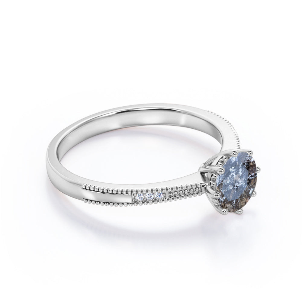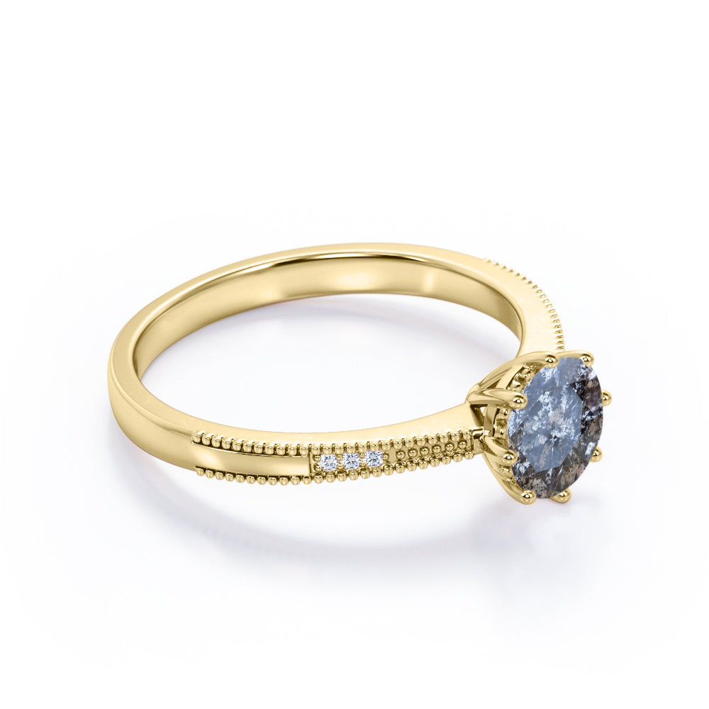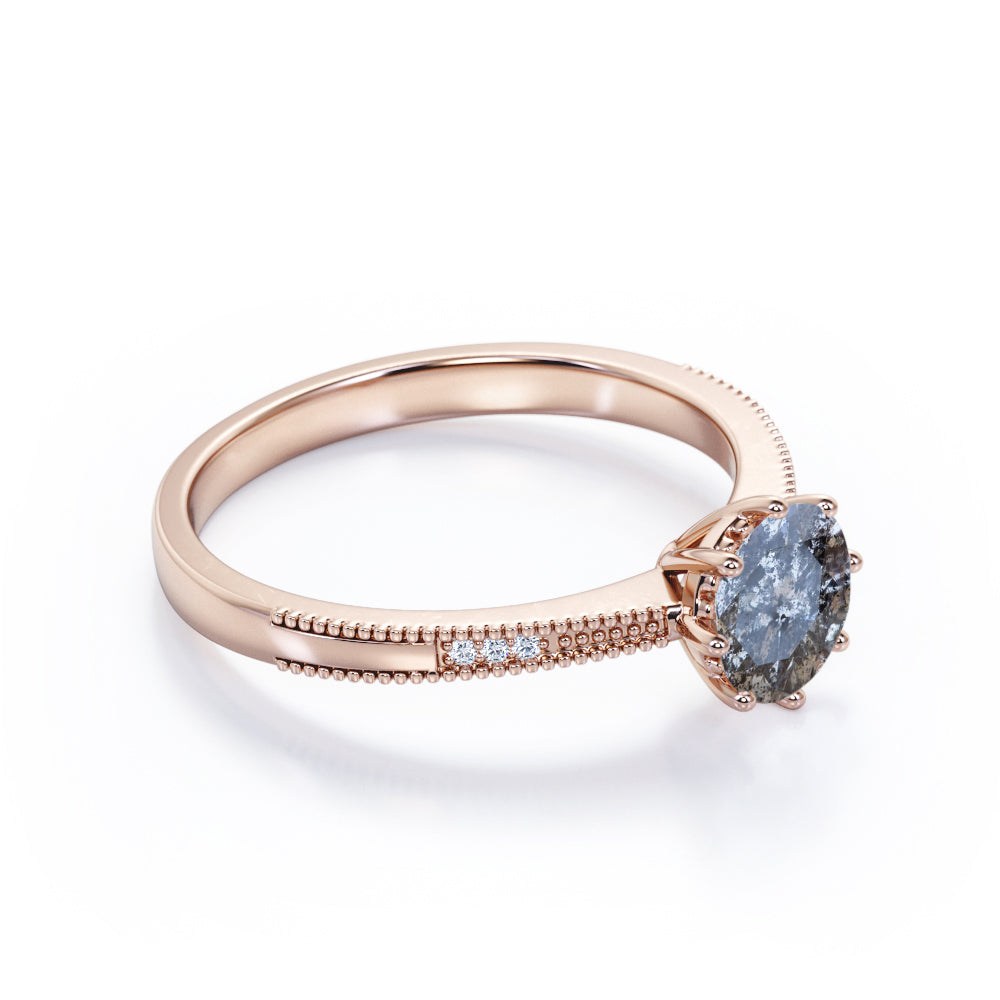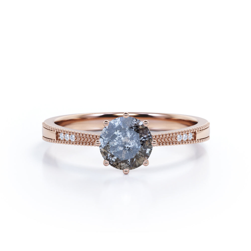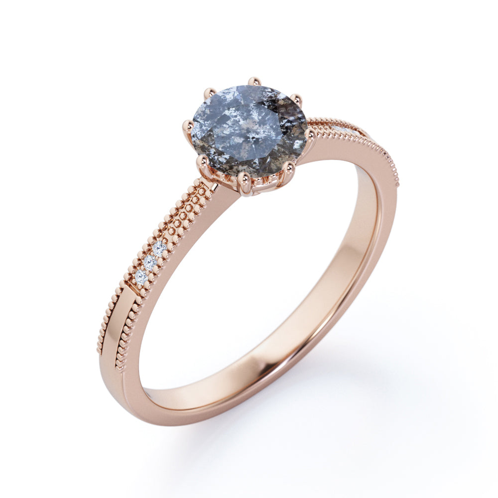 IMPORTANT NOTE: Since each Salt and Pepper Diamonds is one of a kind, the actual color of it may vary from the one that is pictured above. Make her feel special with this Antique 8 Prong .55 Carat Round Cut Fancy Dark Grey Salt and Pepper Diamond Solitaire in Rose Gold for Women. This antique solitaire fancy dark grey Salt and Pepper Diamond engagement ring features .50 carat round cut natural Salt and Pepper Diamond and .05 carat real side diamond for gold ring and moissanite for silver ring. This 8 prong basket Salt and Pepper engagement ring can be customized to either 10k, 14K and Gold over Silver and either Black Gold, Rose Gold, White Gold or Yellow Gold. Also, as your satisfaction is our most priority, we will do our best to have your handmade jewelry be carefully and beautifully crafted by our expert jewelers. The order also comes with a 30-day full refund policy. Enrich your charm and charisma with this vintage dark grey Salt and Pepper Diamond ring for women that is excellent for everyday wear. Design your own flawless look with this natural galaxy Salt and Pepper Diamond ring which you can customize it as per your satisfaction. With no two diamonds exactly alike, Salt and Pepper Diamond gives each ring character and style. If you are searching for some alternate gemstone with unique appearance, this Salt and Pepper Diamond ring will be your right choice. Salt and Pepper Diamonds are eco-friendly, ethical, and environmental friendly. Its inclusions will distinguish your ring offering a unique look on your finger . Diversity of Salt and Pepper provides additional character to your traditional engagement ring. Being considered a very eccentric gemstone, Salt and Pepper will create a timeless and fabulous engagement ring. Sparkle your finger with this ring which is perfect for any occasion and everyday wear. With its mesmerizing salt and pepper inclusions, it is sure to enchant your special someone with gracefulness.