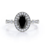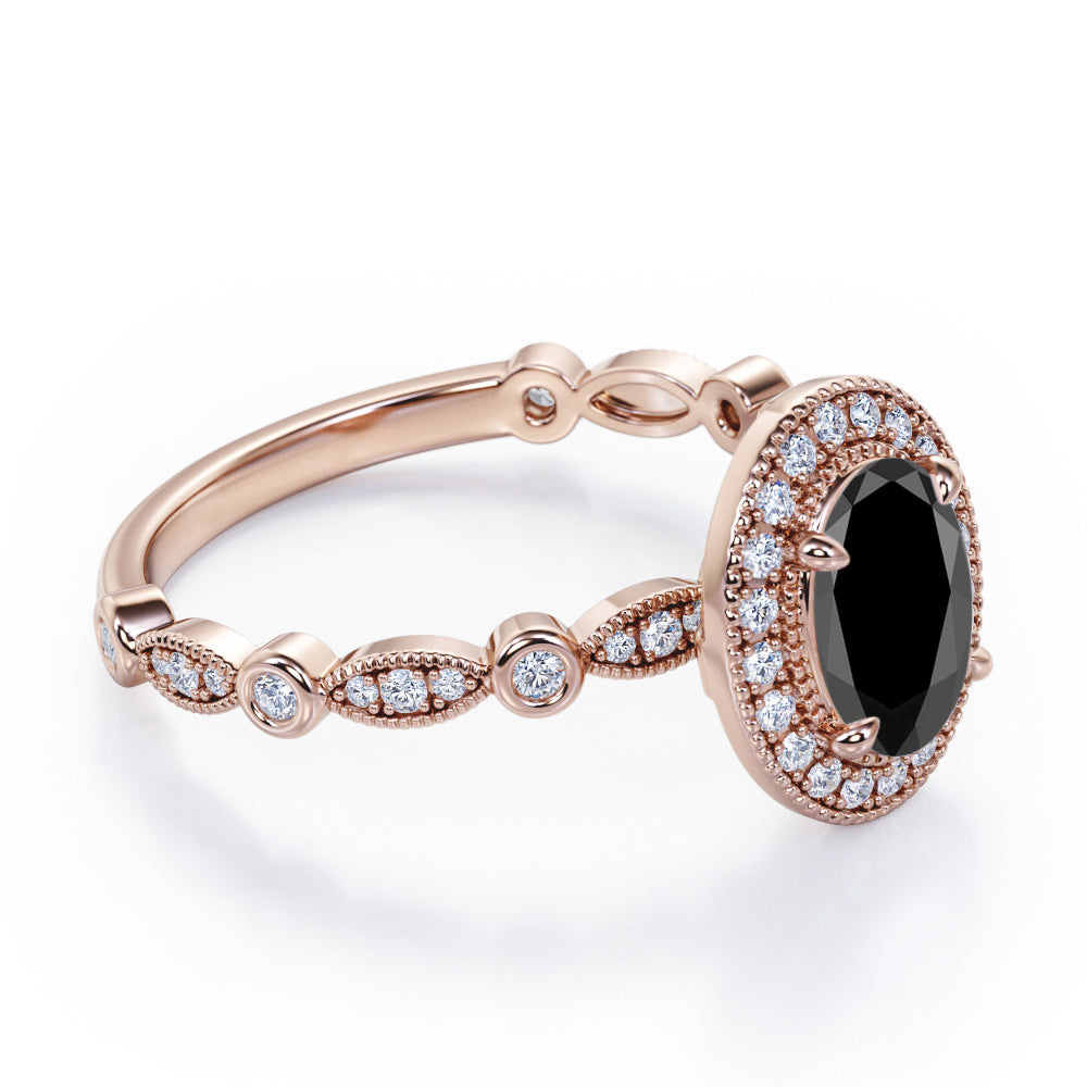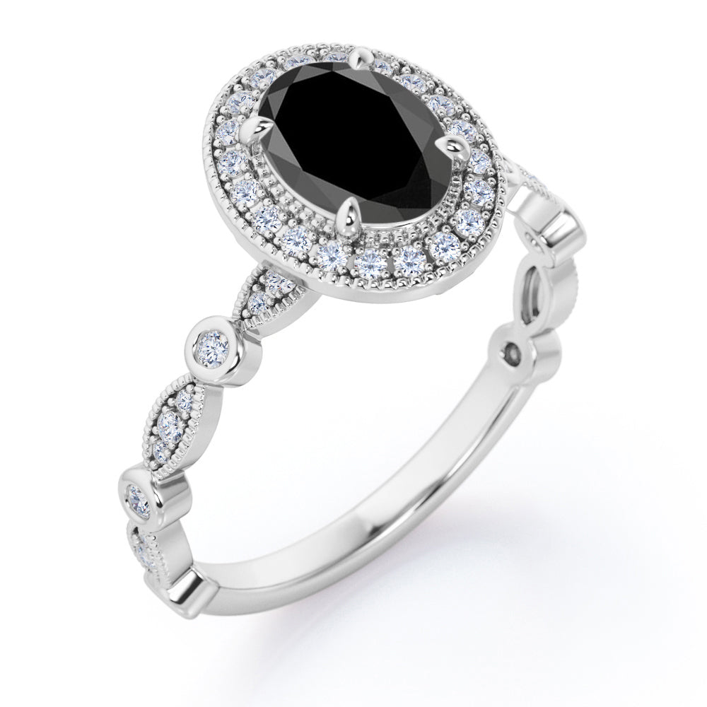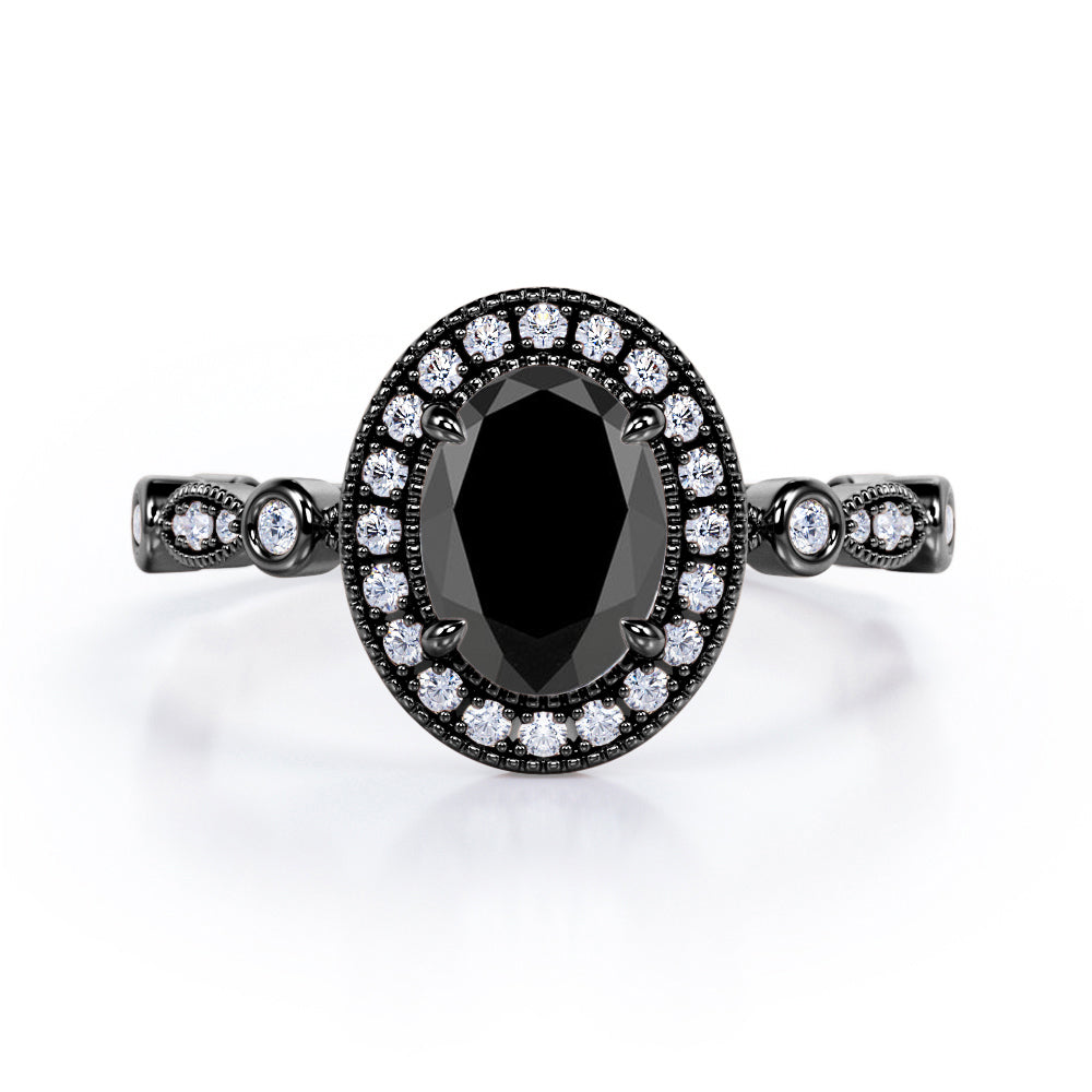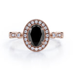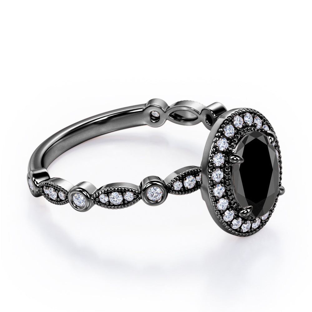 Antique Art Deco 1.35 Carat Oval Cut Black Diamond Halo Engagement Ring In Black Gold. Get ready to turn some heads with our timeless halo oval cut black diamond engagement ring. A stunning and affordable option, this vintage engagement ring puts on quite the show. The sparkling halo of white diamonds encloses an oval cut opal of 1 carat. The ring's shank is adorned with marquise-shaped frames set with tiny diamonds of 0.35 carat for even more bling. Romantic and vintage-inspired, this cluster set art deco style showpiece is handmade with deep love and attention by our well-experienced craftsmen. This antique art deco 1.35 carat oval cut black diamond halo engagement ring in black gold can also be customized to 10k Gold or 14k Gold as per your choice.