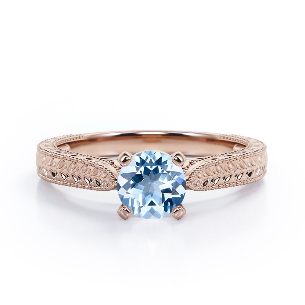 Antique Art Deco 1 Carat Round Cut Aquamarine Four Prong Solitaire Engagement Ring In Rose Gold. An Art Deco ring bringing together a brilliant round cut solitaire aquamarine at the center and art work on a plain rose gold band. The exclusive piece is the perfect vintage pick for the bride who wants something simple yet conventional. This ring screams romance with its heart motif and commendable art deco work set in a rose gold band. Theres a subtly fluid feel to this eye-catching ring with its vintage milgrain edging. This magnificent engagement ring features 1 carat aquamarine as the center stone. Handmade with utmost love and patience, this antique art deco 1 carat round cut aquamarine four prong solitaire engagement ring in rose gold can also be customized into 18k gold plating over silver, 10k Gold or 14k Gold as per you preference.