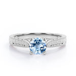 Antique Art Deco 1 Carat Round Cut Aquamarine Four Prong Solitaire Engagement Ring In Rose Gold. An Art Deco ring bringing together a brilliant round cut solitaire aquamarine at the center and art work on a plain rose gold band. The exclusive piece is the perfect vintage pick for the bride who wants something simple yet conventional. This ring screams romance with its heart motif and commendable art deco work set in a rose gold band. Theres a subtly fluid feel to this eye-catching ring with its vintage milgrain edging. This magnificent engagement ring features 1 carat aquamarine as the center stone. Handmade with utmost love and patience, this antique art deco 1 carat round cut aquamarine four prong solitaire engagement ring in rose gold can also be customized into 18k gold plating over silver, 10k Gold or 14k Gold as per you preference.