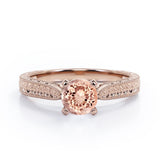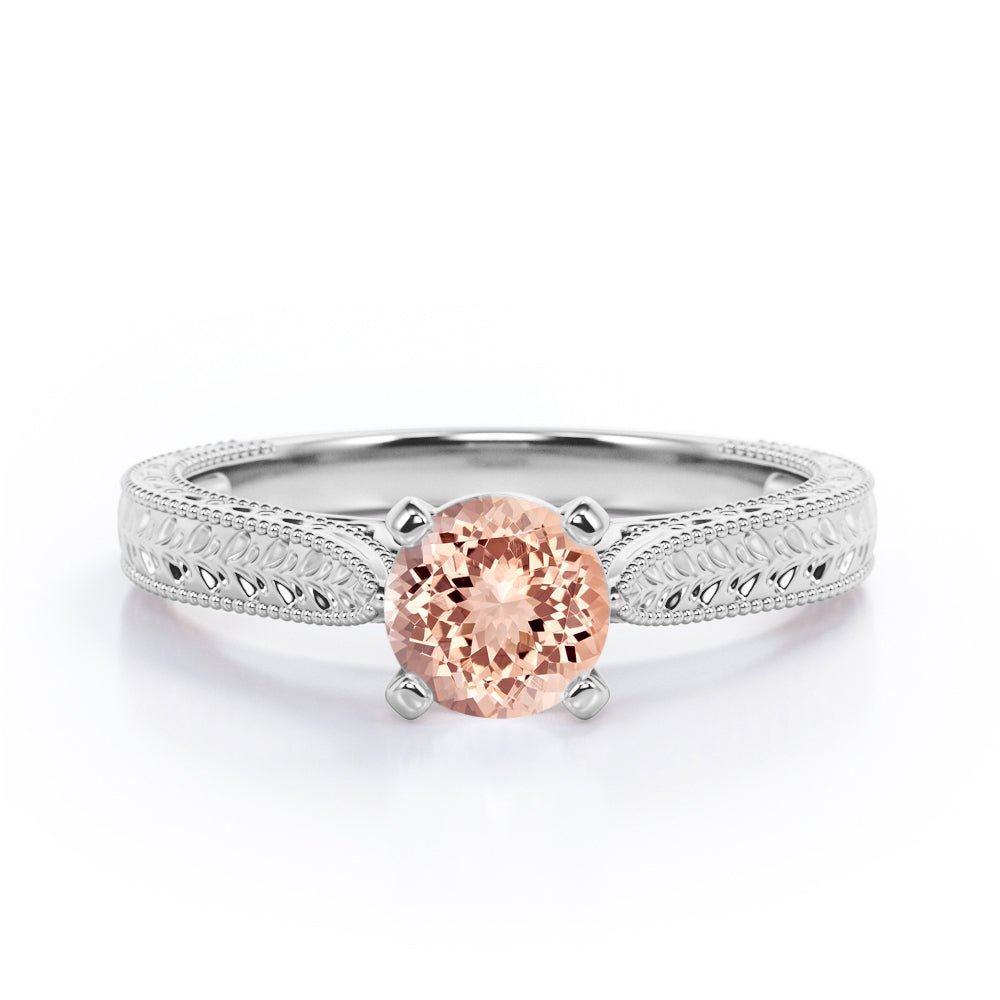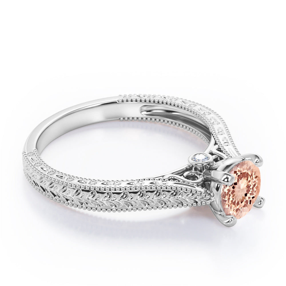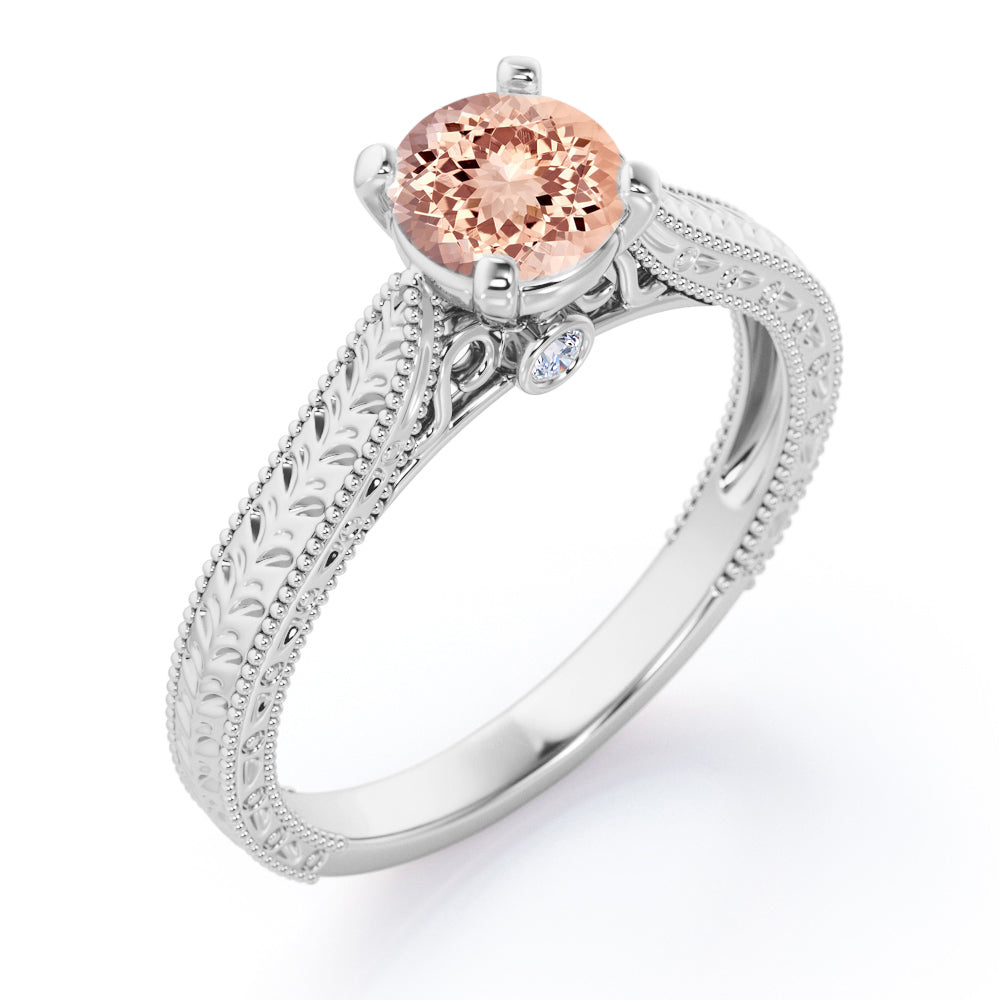 Antique Art Deco 1 Carat Round Cut Morganite Four Prong Solitaire Engagement Ring In White Gold. An Art Deco ring bringing together a brilliant round cut solitaire morganite at the center and art work on a plain white gold band. The exclusive piece is the perfect vintage pick for the bride who wants something simple yet conventional. This ring screams romance with its heart motif and commendable art deco work set in a white gold band. Theres a subtly fluid feel to this eye-catching ring with its vintage milgrain edging. This magnificent engagement ring features 1 carat morganite as the center stone. Handmade with utmost love and patience, this antique art deco 1 carat round cut morganite four prong solitaire engagement ring in white gold can also be customized into 18k gold plating over silver, 10k Gold or 14k Gold as per you preference.