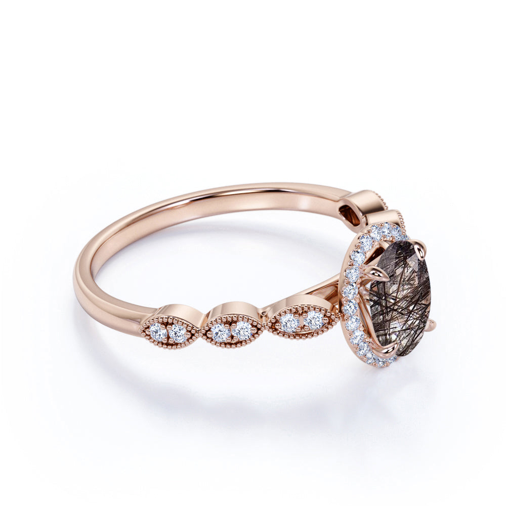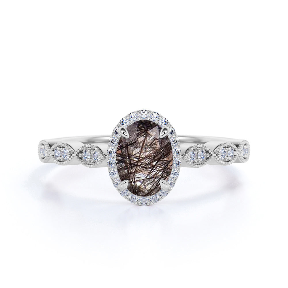 Create an incredibly beautiful look on her finger with this Antique Art Deco 1.50 Carat Oval Cut Transparent Black Brown Rutile Quartz and Diamond Halo Engagement Ring. This antique art deco solid dendritic rutilated quartz engagement ring features 1 carat oval cut real rutilated quartz and .50 carat real side diamond for gold ring and moissanite for silver ring. This halo engagement ring can be customized to either 10k, 14K and Gold over Silver and either Black Gold, Rose Gold, White Gold or Yellow Gold. Also, as your satisfaction is our most priority, we will do our best to have your handmade jewelry be carefully and beautifully crafted by our expert jewelers. The order also comes with a 30-day full refund policy. This clear crystal with black needle inclusions ring will surely be a perfect gift for your significant other. It is crowned as a highly beneficial crystals to aid wearers in manifesting what they are desire into their lives. This tourmalinated black rutilated quartz is believed to be a protection against the ill thoughts of others. Own this ring which displays a combination of quartz and rutile that creates an amazing vibration and stand out from the rest. This rutilated crystal quartz ring is a very perfect alternative to those traditional ring because of its incredibly beautiful needle inclusions. It can be customized as per your satisfaction and available in both silver and gold metal. While many gemstones are most valuable when they contain few or no inclusions, rutilated quartz is actually prized because of its unique inclusions. Being considered a powerful amplifiers of thoughts, this natural rutilated quartz ring offers connection to the Divine mind and receipt of Divine inspiration. Impress your special someone with this beautiful and affordable natural black hair rutilated quartz ring. It is the perfect match for those who are looking for a remarkable gemstone rings as rutilated quartz embodies their own unique intriguing patterns and uplifting meaning.