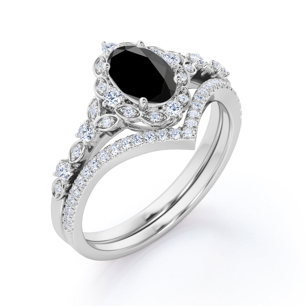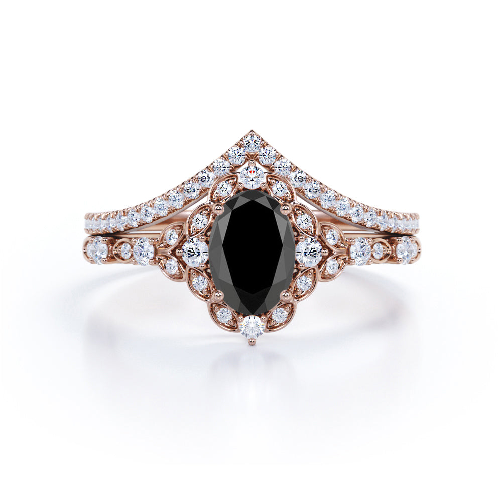 Antique Artdeco 1.25 Oval cut Lab Black Diamond Wedding Bridal Set in Rose Gold