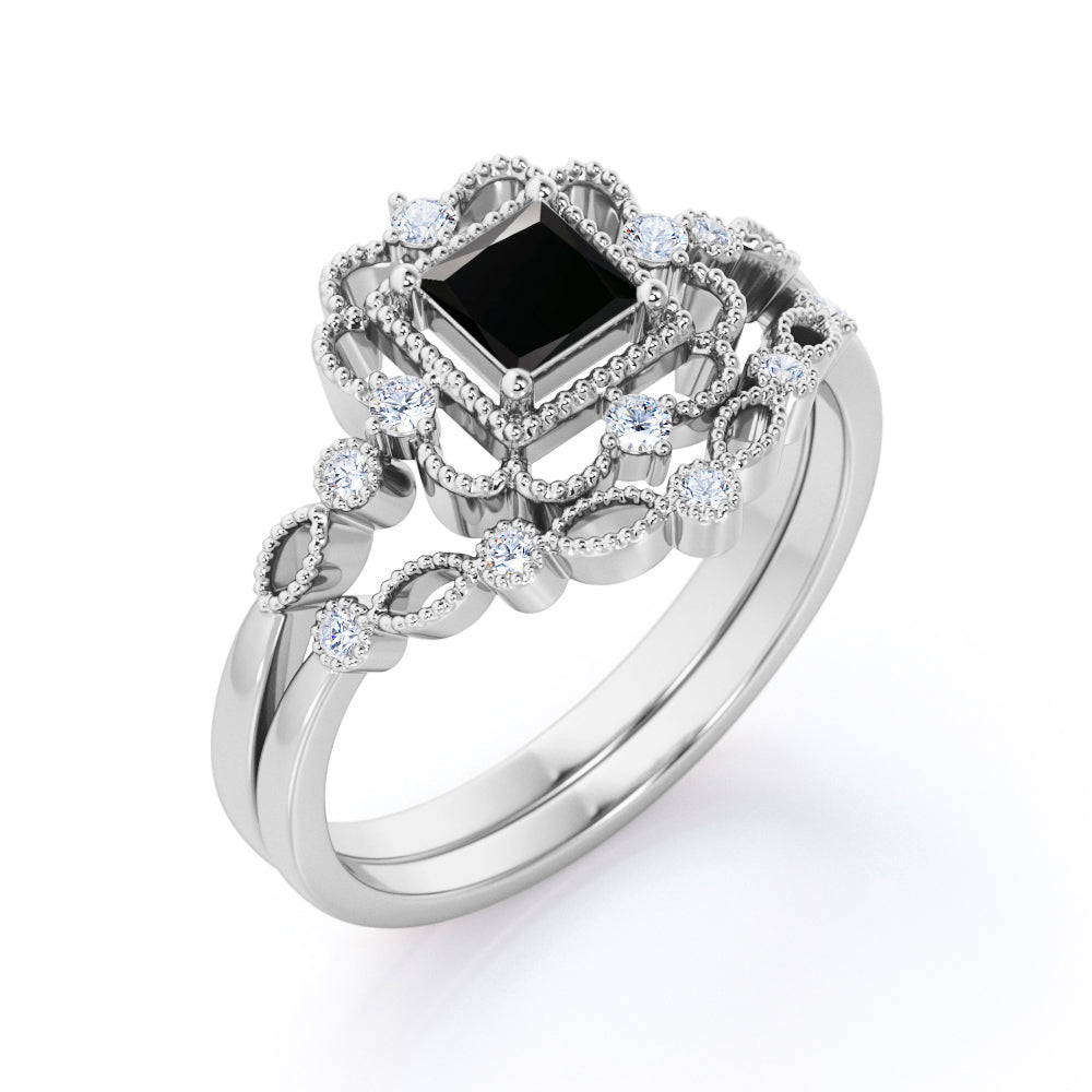 Antique Artdeco 1.25 Princess cut Black Diamond Wedding Bridal Set in Rose Gold. This is a beautiful vintage design sparkling black Diamond bridal ring set, perfect for her, highlights total 1.25 carats perfect lab created black diamond and glittering diamonds and is made in solid 10k Rose Gold. The beautiful wedding ring band is handmade and personalized by me or one of my other skilled jewelry associates with over 15 years of experience. And as always, the order comes with our 30 DAYS FULL REFUND policy, GUARANTEED DELIVERY within 5 Days, and in a BEAUTIFUL Jewelry Ring Box.