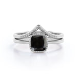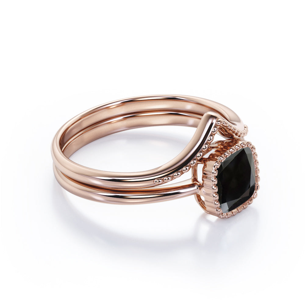Antique Artdeco 1.25 Cushion cut Lab Black Diamond Wedding Bridal Set in Rose Gold. Superbly crafted vintage design sparkling black Diamond bridal ring set, perfect for her, features total 1.25 carats perfect lab created black diamond and glittering diamonds and is made in solid 10k Rose Gold. The piece is handmade, for a refreshingly beautiful and unique look, away from the ordinary. And as always, the order comes with our 30 DAYS FULL REFUND policy, GUARANTEED DELIVERY within 5 Days, and in a BEAUTIFUL Jewelry Ring Box.