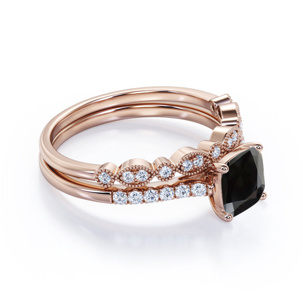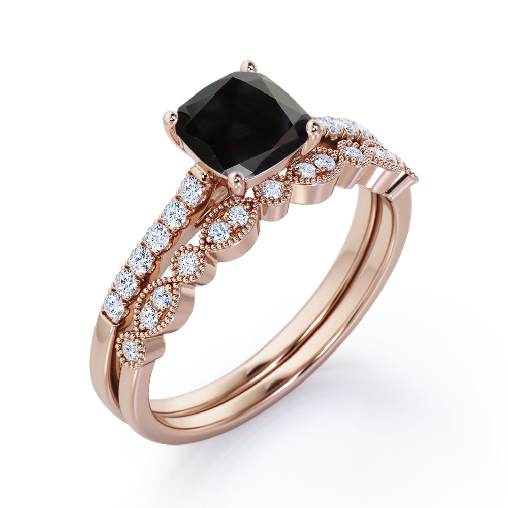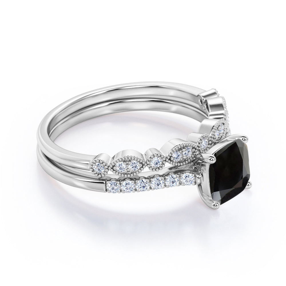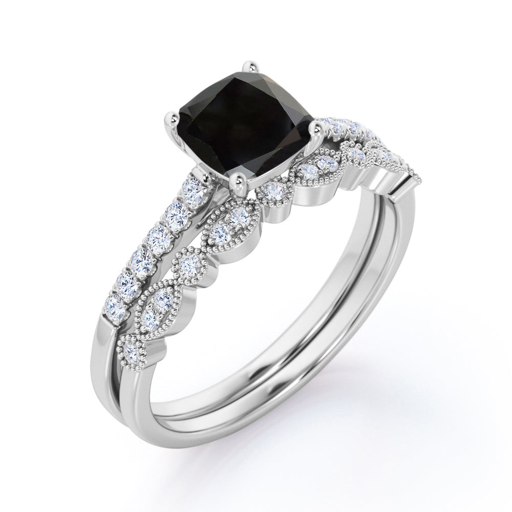 Antique Artdeco 1.50 Cushion cut Lab Black Diamond Wedding Bridal Set in White Gold