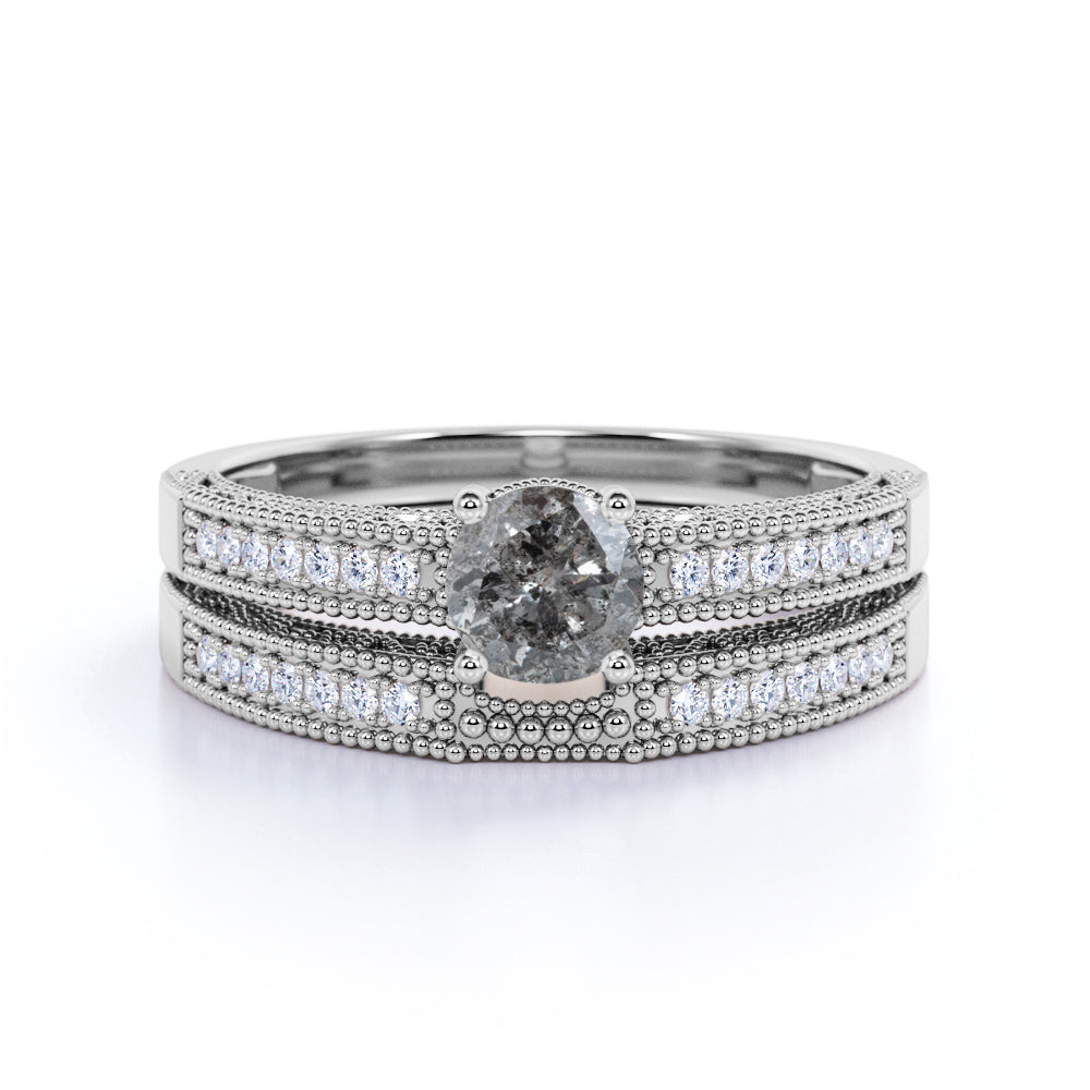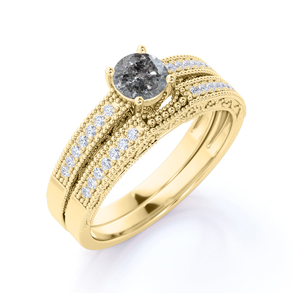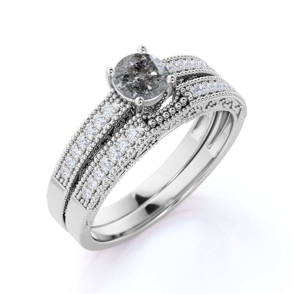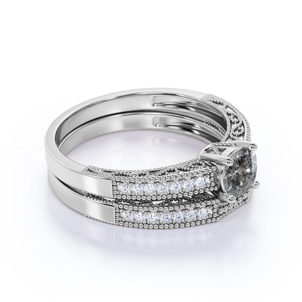 0.85 Ct Round Salt and Pepper Diamond Vintage Wedding Ring Set