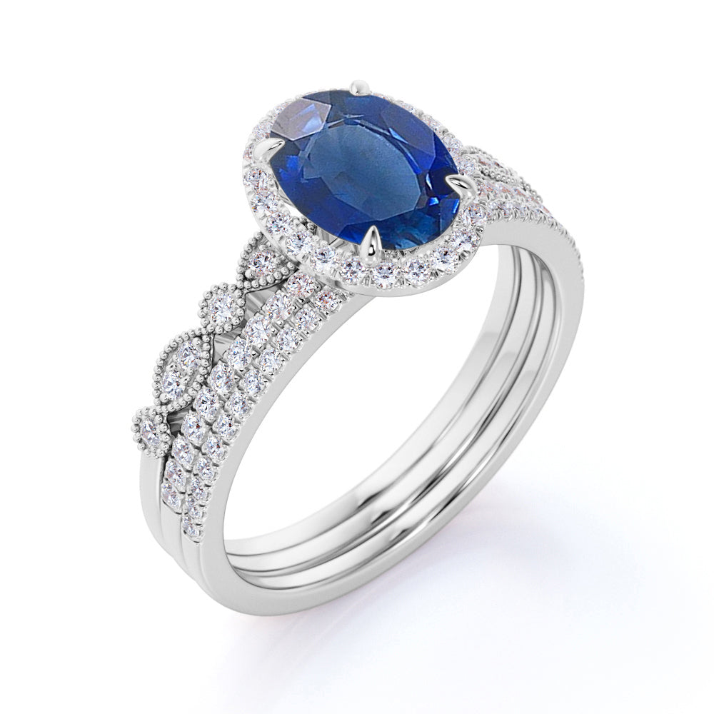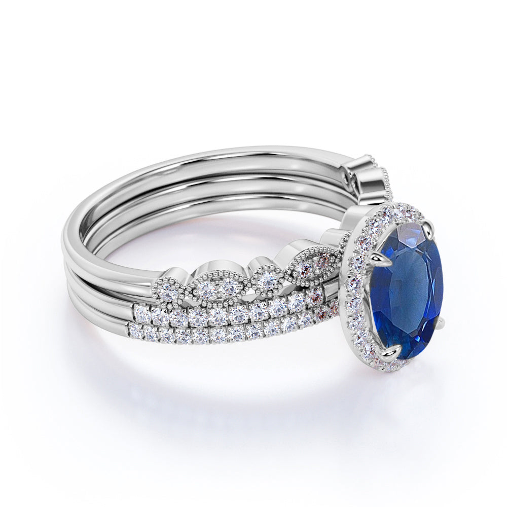 Antique Design 2 Carat Oval Cut Lab-Created Sapphire and Diamond Halo Trio Bridal Ring Set in White Gold